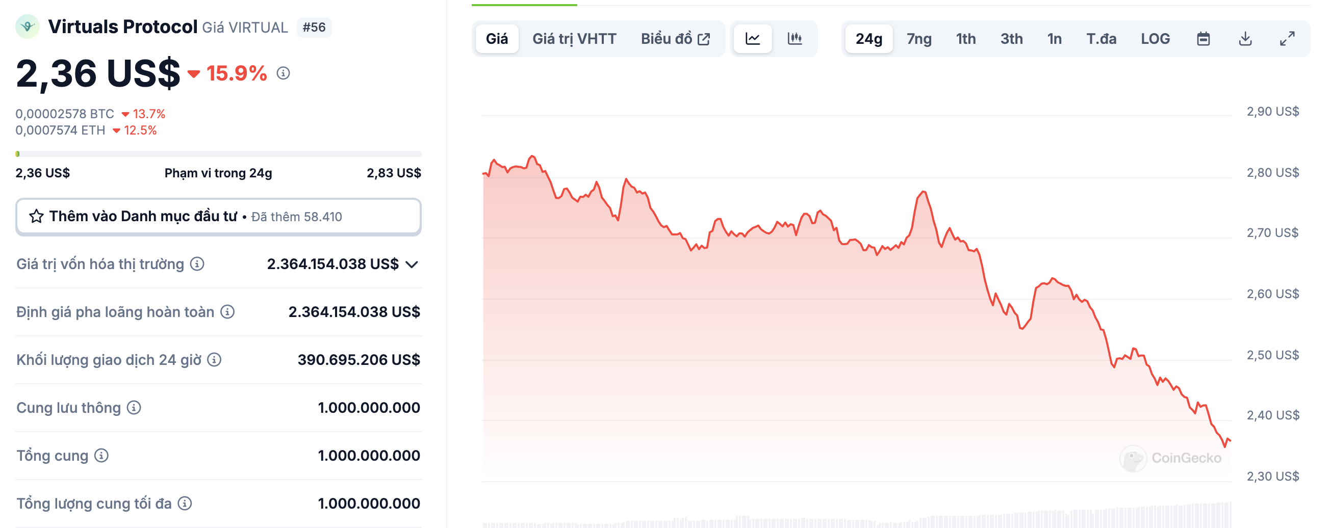 Tình hình không khá hơn với Virtuals Protocol - một dự án cho phép người dùng xây dựng các trợ lý AI phi tập trung. Giá token này giảm tới 48% so với tuần trước, từ hơn 5 USD xuống còn 2,6 USD, đưa vốn hóa thị trường về mức 2,6 tỷ USD.