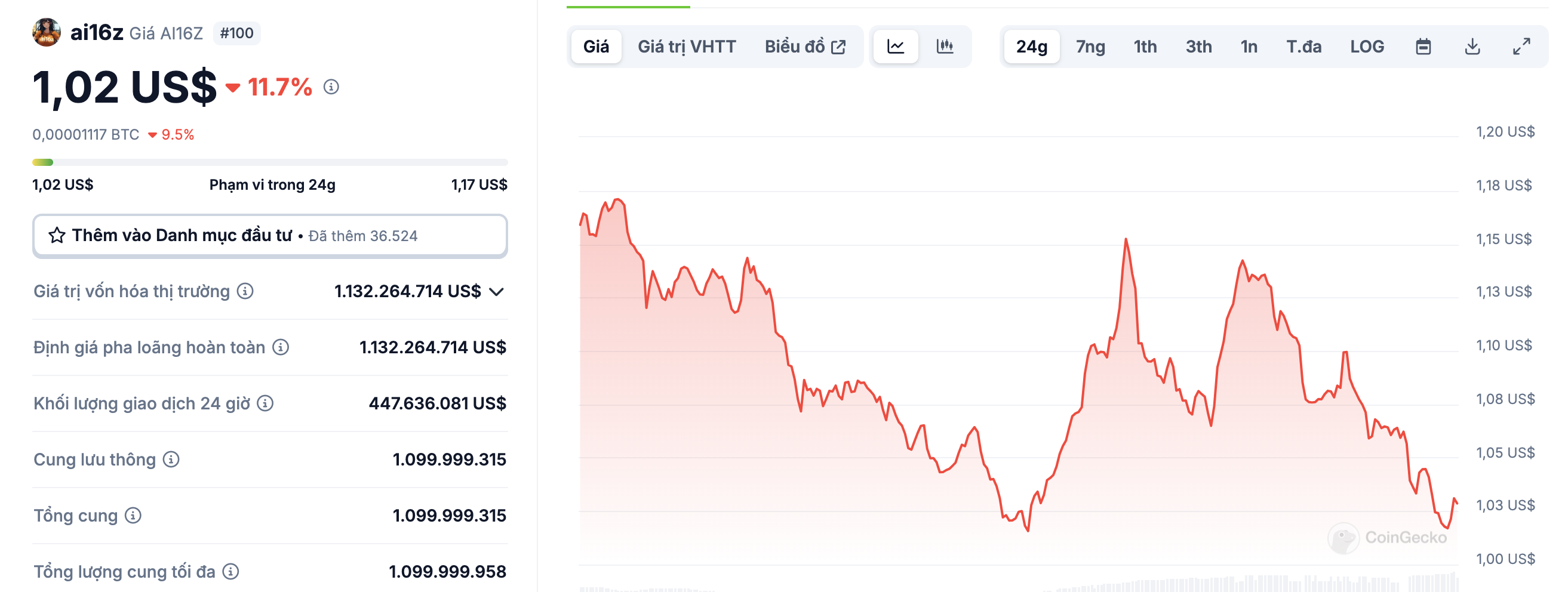 Tuần qua, hàng loạt token AI agent chứng kiến sự sụt giảm không phanh. Ai16z - token của dự án nổi bật với quỹ đầu tư mạo hiểm dựa trên DAO và framework Eliza OS, đã giảm mạnh từ 2,26 USD xuống còn 1,1 USD. Điều này khiến vốn hóa thị trường lao dốc xuống mức 1,1 tỷ USD. Đáng chú ý, chỉ trong 24 giờ qua, token này tiếp tục giảm thêm 10%, khiến nhà đầu tư không khỏi lo ngại.