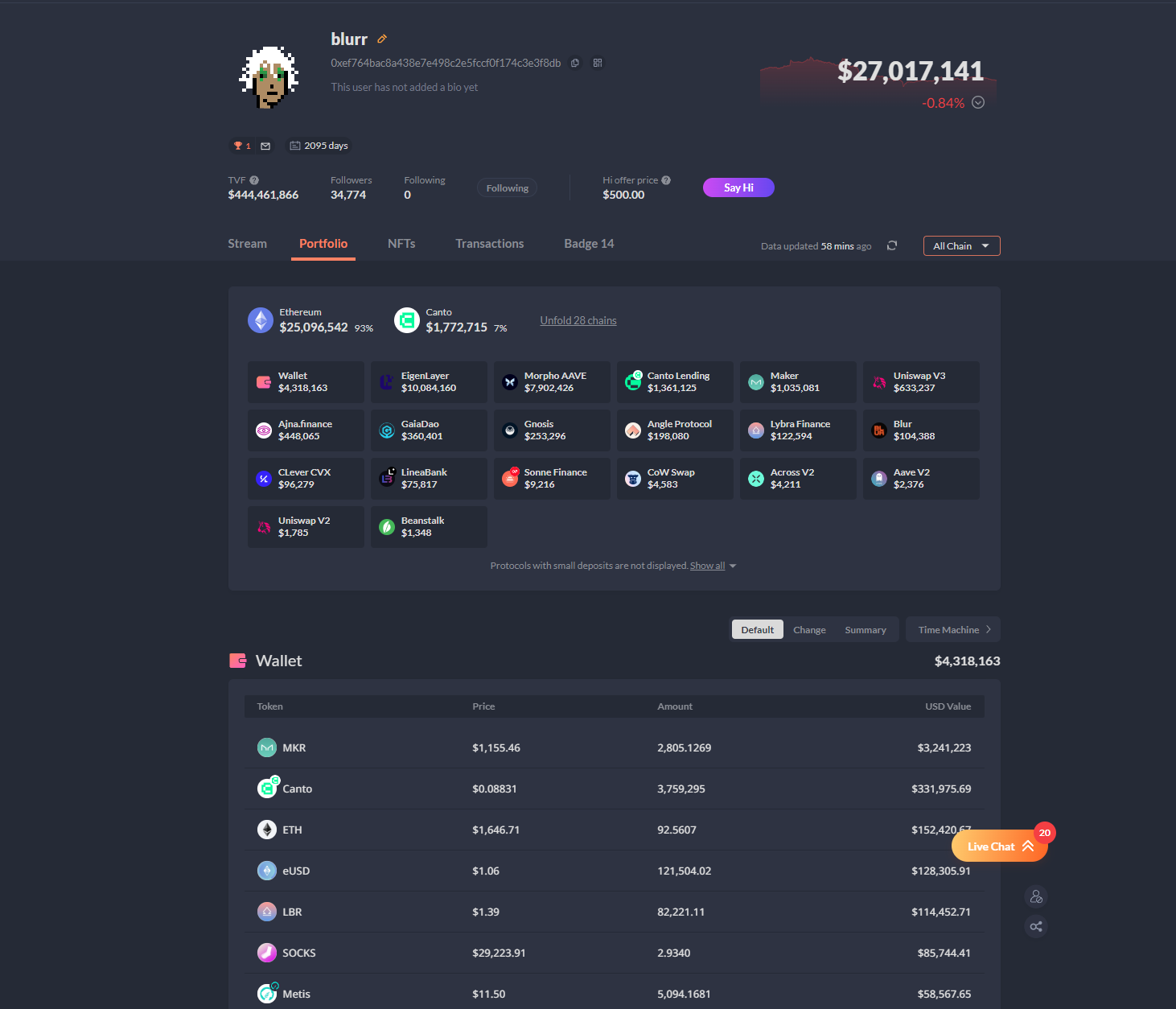 Theo dõi danh mục đầu tư (Portfolio): Với chức năng này, bạn có khả năng quản lý tài sản của mình trên nhiều blockchain khác nhau một cách dễ dàng. Bạn chỉ cần nhập địa chỉ ví, và tất cả thông tin về tài sản của bạn sẽ hiển thị ngay trước mắt. Ngoài ra, Debank cũng hỗ trợ theo dõi các hoạt động như staking, cung cấp thanh khoản trên các giao thức, hay tham gia vào việc lending/borrowing. Hơn nữa, đây cũng là một cung cụ giúp cho bạn có thể dễ dàng theo dõi hành động của người khác, điển hình như các “Cá Voi”.