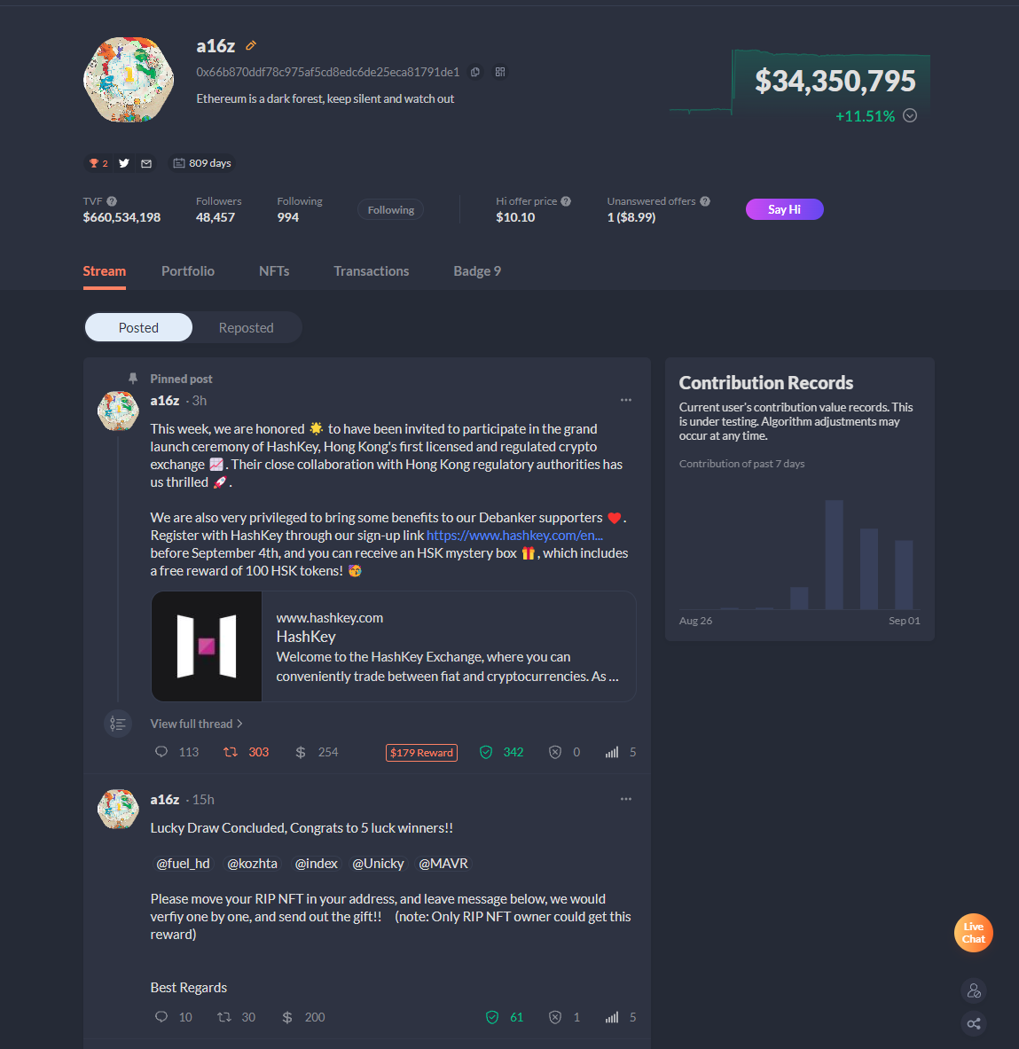 DeBank Stream là một tính năng thú vị, và đặc biệt ấn tượng vì nó dựa trên nền tảng theo dõi ví hiện có của DeBank. Bạn có thể kiểm tra ví của các KOLs khi họ nói về một token mới. Tất cả thông tin được lưu trữ trên blockchain, không có chỗ cho sự gian lận. Một điều đáng chú ý khác trong DeBank Stream là khái niệm TVF (Total Value Followers). Không quan trọng là bạn có bao nhiêu tiền trong ví, bạn vẫn có thể trở thành một nhà sáng tạo nội dung thành công. Điều quan trọng là tương tác và số lượng người theo dõi của bạn. Điều này có thể liên tưởng đến Friend.tech, mạng lưới càng rộng, tiếp cận càng nhiều, “giá trị” càng lớn.