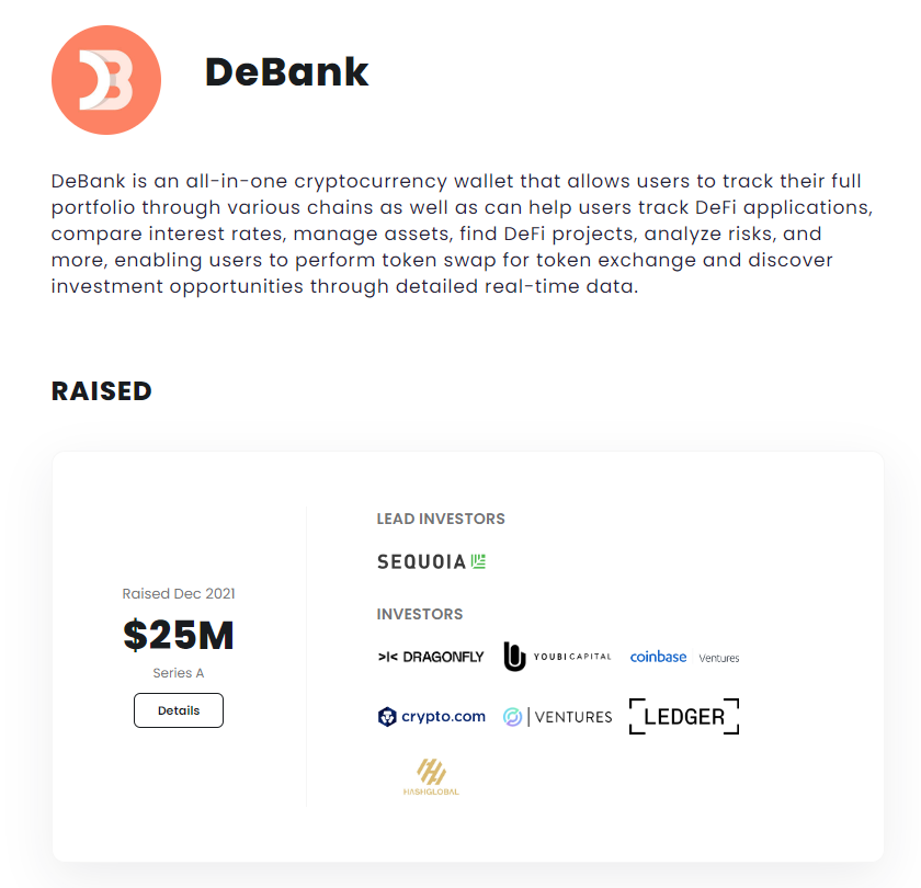 Debank đã gọi vốn thành công vòng Series A vào năm 2021 với số vốn 25 triệu USD, đây là vòng gọi vốn được dẫn đầu bởi Sequoia và có sự góp mặt của các VCs nổi tiếng như : DragonFly, Coinbase, Crypto.com, Circle, Ledger…