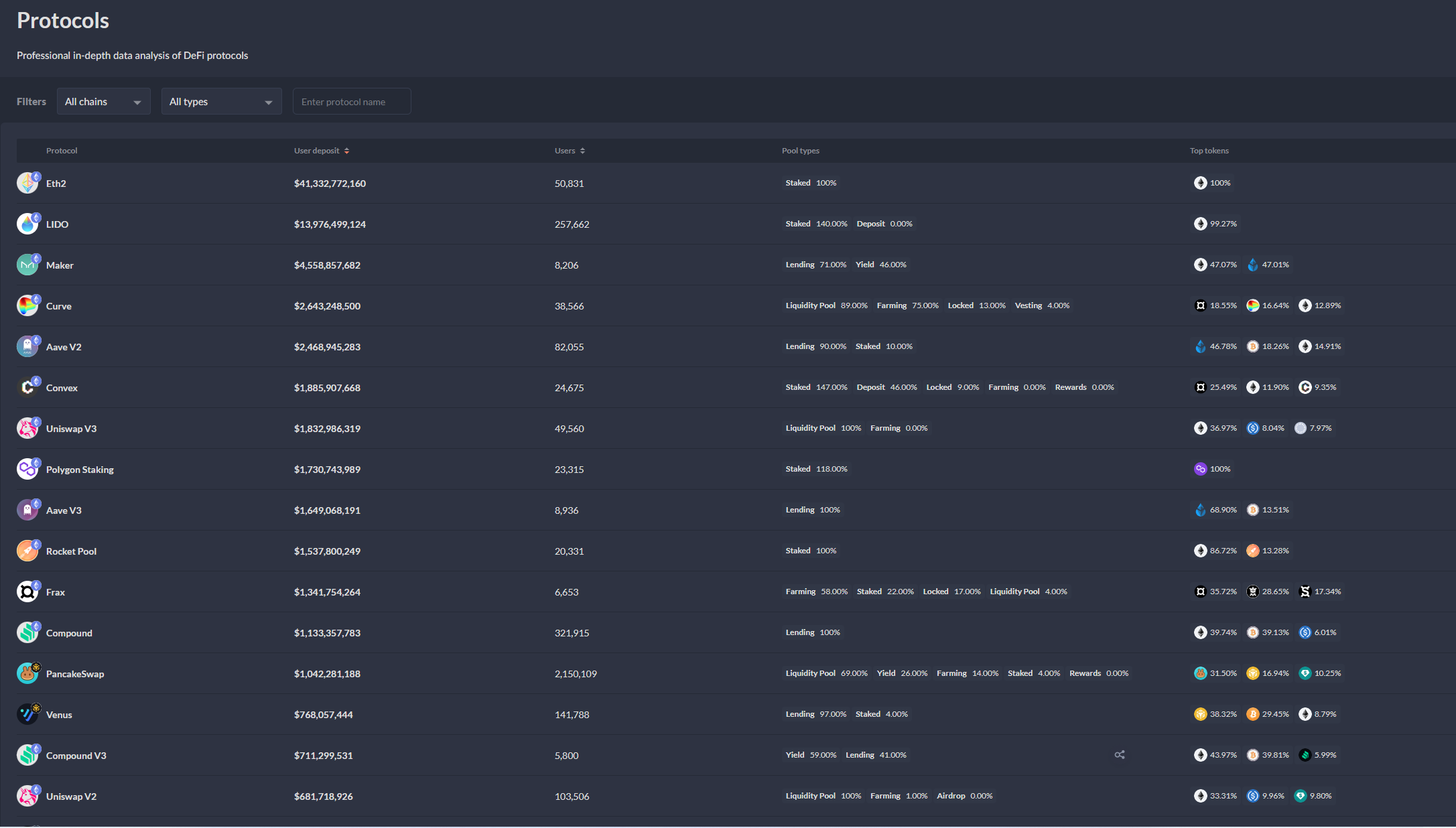 Protocols: Cho phép người dùng theo dõi các giao thức Defi trên nhiều chuỗi khối khác nhau, gồm những thông tin quan trọng như User Deposit, Users, Pool Types…
