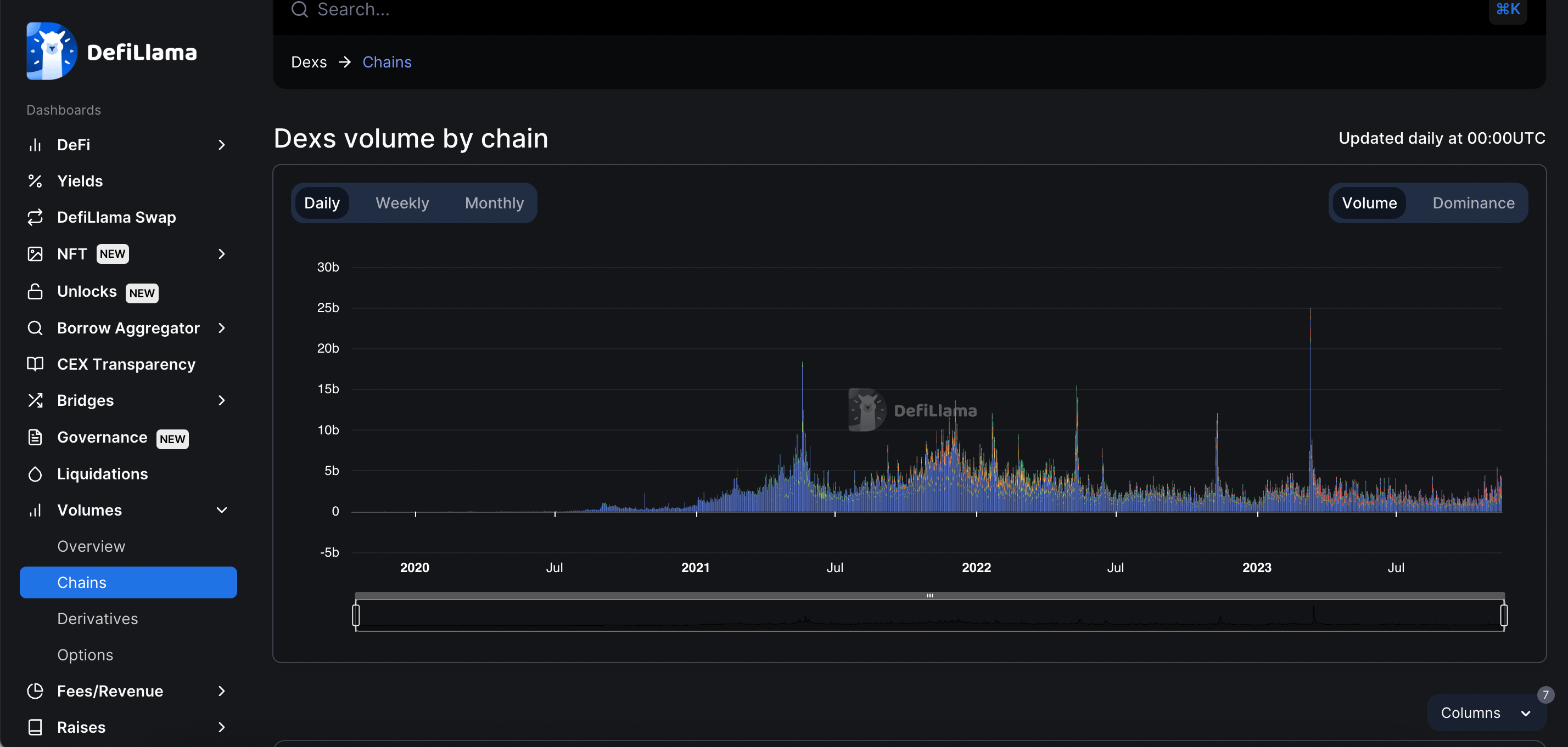 Trên DefiLlama các thông số liên quan đến khối lượng giao dịch sẽ được thống kê như sau: