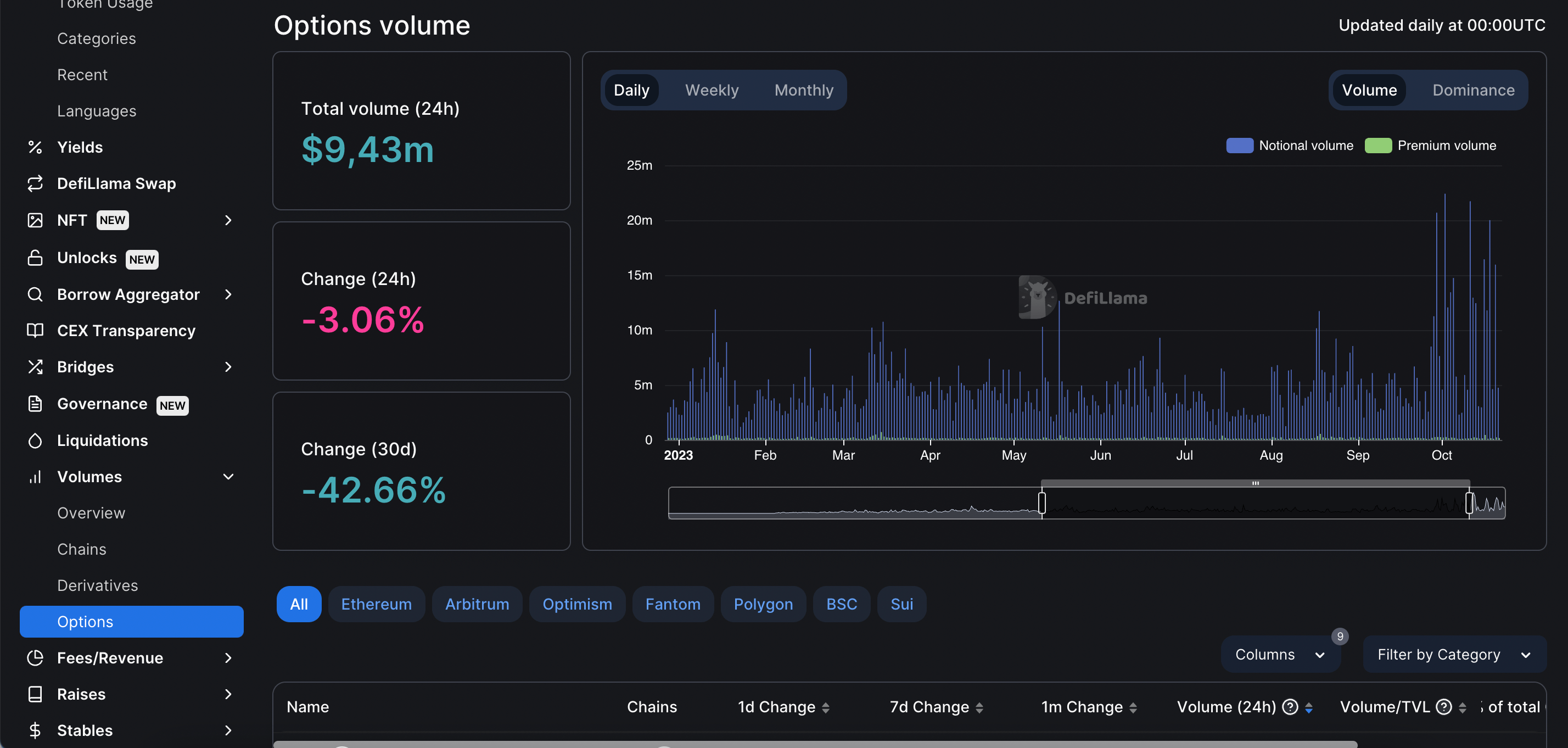 Thống kê khối lượng giao dịch của các giao thức Options (Hợp đồng quyền chọn) và tổng hợp thông tin chi tiết của từng giao thức được sắp xếp theo thứ tự từ trên xuống dưới về khối lượng giao dịch.