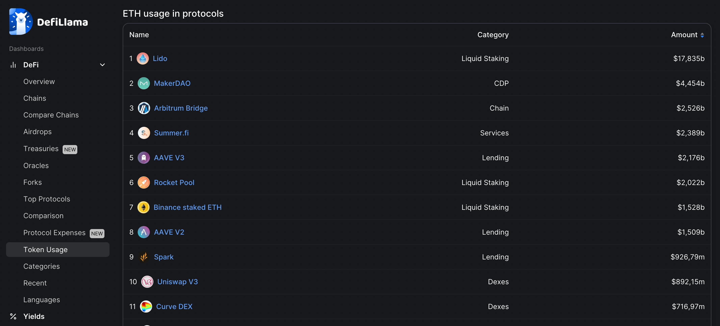 Ví dụ bạn có thể kiểm tra các giao thức hàng đầu trên mạng Ethereum theo từng danh mục cụ thể: