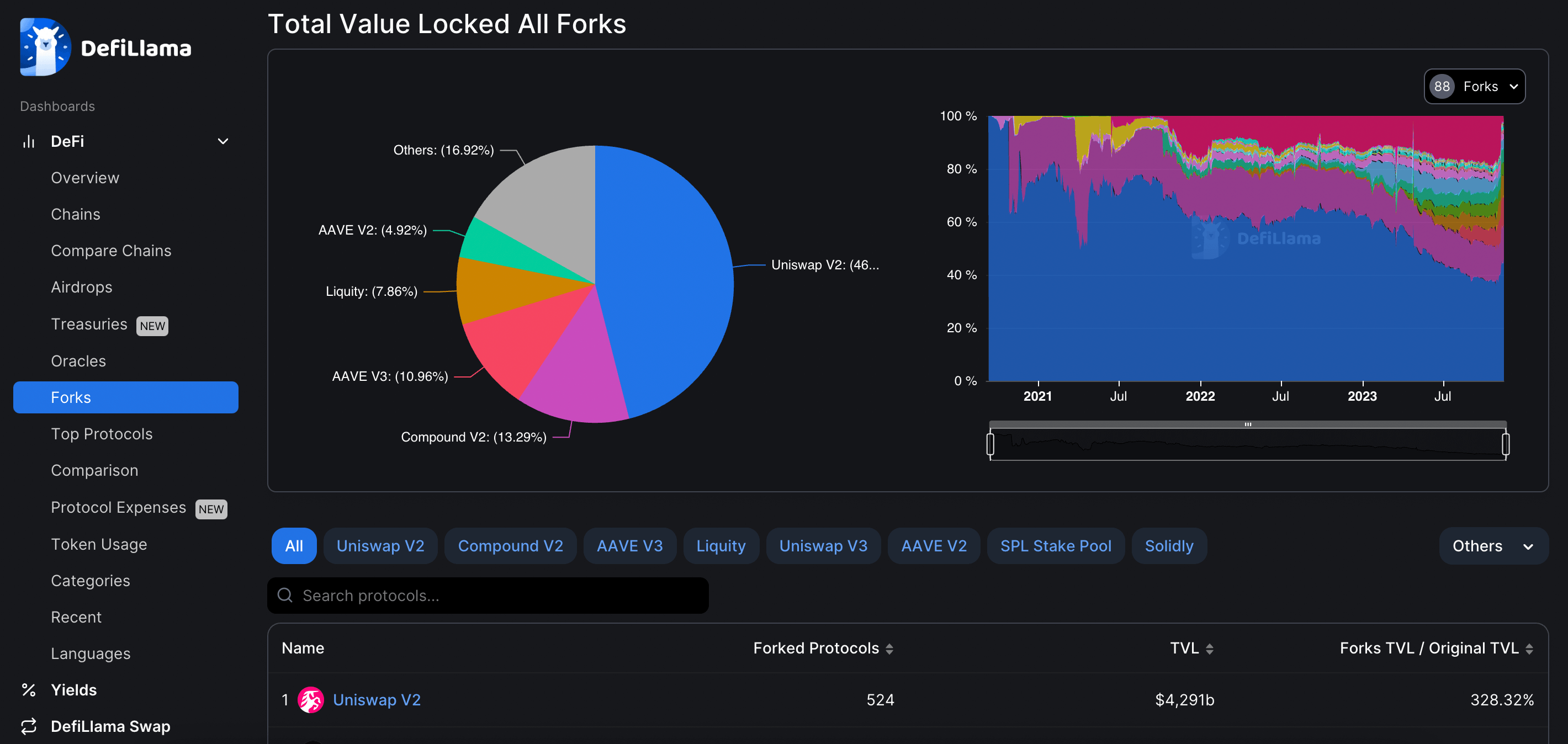 Các Forks đại diện cho các phiên bản được cải tiến của phần mềm gốc và thường được tái sử dụng để phát triển. Do đó, việc sao chép các ứng dụng hiện tại để tạo ra các bản Forks trở nên phổ biến trong cộng đồng các nhà phát triển. Trong nhiều tình huống, những Fork này có thể đạt được TVL cao hơn so với các ứng dụng ban đầu.