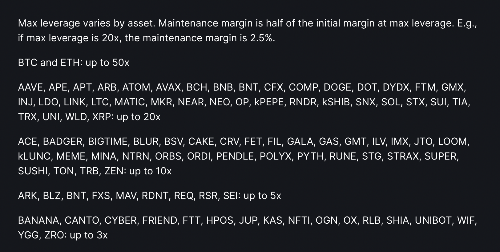 Mỗi token khác nhau sẽ được hỗ trợ với tỉ lệ đòn bẩy khác nhau. Ví dụ đối với BTC và ETH, đòn bẩy lên đến x50 lần. Với các tài sản khác, đòn bẩy dao động từ x5 đến x20.