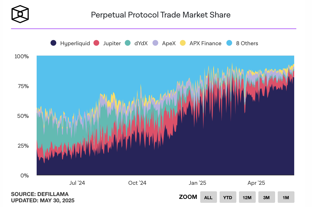 Hyperliquid - một nền tảng giao dịch hợp đồng tương lai phi tập trung (DeFi) đã vươn lên trở thành nhà lãnh đạo không thể tranh cãi trong lĩnh vực này, nắm giữ tới 80% thị phần trong số các giao thức hợp đồng tương lai DeFi. Sự thống trị này đánh dấu một bước ngoặt quan trọng trong cuộc đua thu hút các nhà giao dịch đang rời bỏ các sàn giao dịch tập trung như Binance hay Bybit để tìm kiếm các giải pháp phi tập trung an toàn và minh bạch hơn. Chỉ trong sáu tháng, từ tháng 11 năm 2024, Hyperliquid đã tăng thị phần từ 30% lên mức ấn tượng hiện tại, thể hiện tốc độ tăng trưởng vượt bậc và sức hút mạnh mẽ của mô hình phi tập trung.