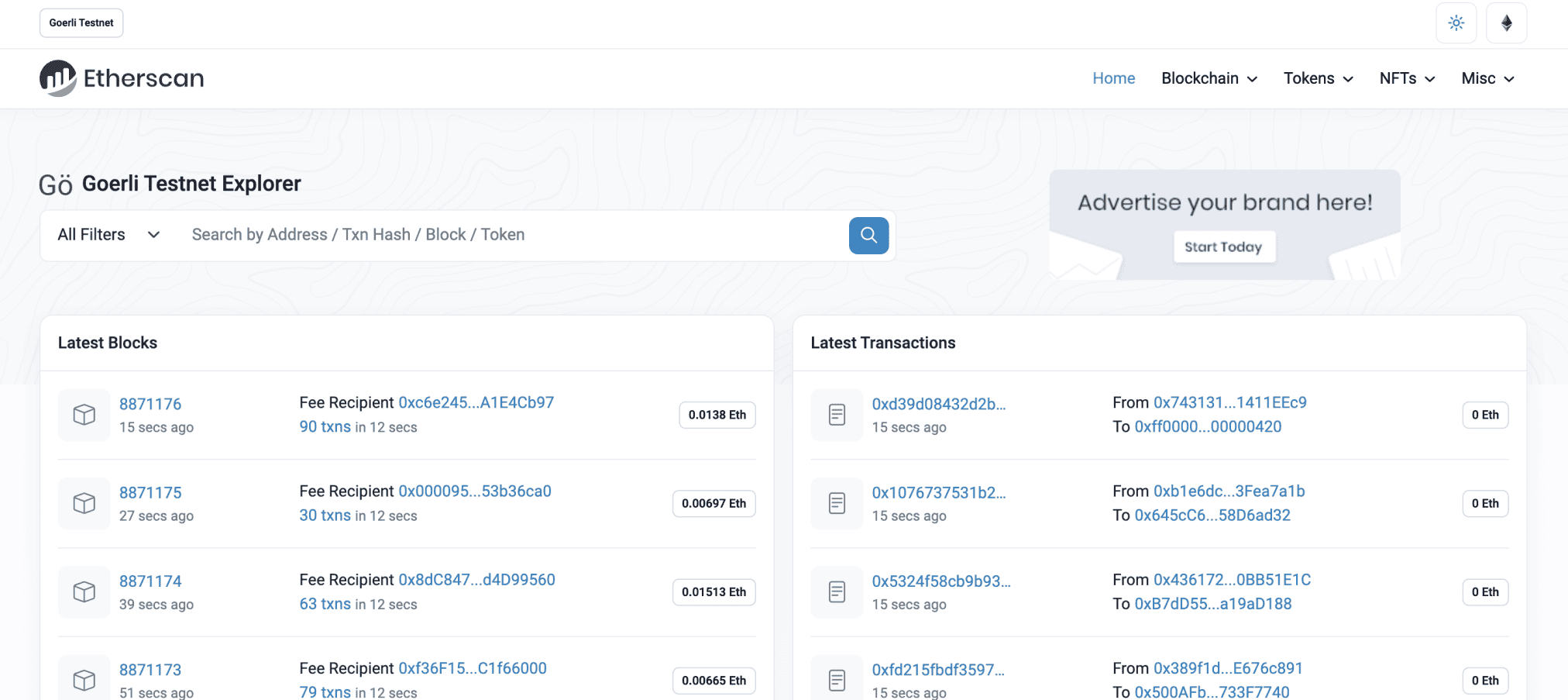 Với mục đích tạo ra môi trường tương tự nhất có thể với mạng chính để tạo điều kiện cho phép các nhà phát triển có thể dễ dàng và thoải mái thử nghiệm các sản phẩm cũng như dự án của mình trên mạng thử nghiệm, trình khám phá chuỗi khối là một công cụ không thể thiếu đối với các nhà phát triển và người dùng. Chính vì vậy, Goerli Testnet Explorer được phát triển cho phép người dùng hoàn toàn có thể theo dõi quá trình xử lý giao dịch của mình. Goerli Etherscan là một nền tảng tương tự như Etherscan của mạng chính.