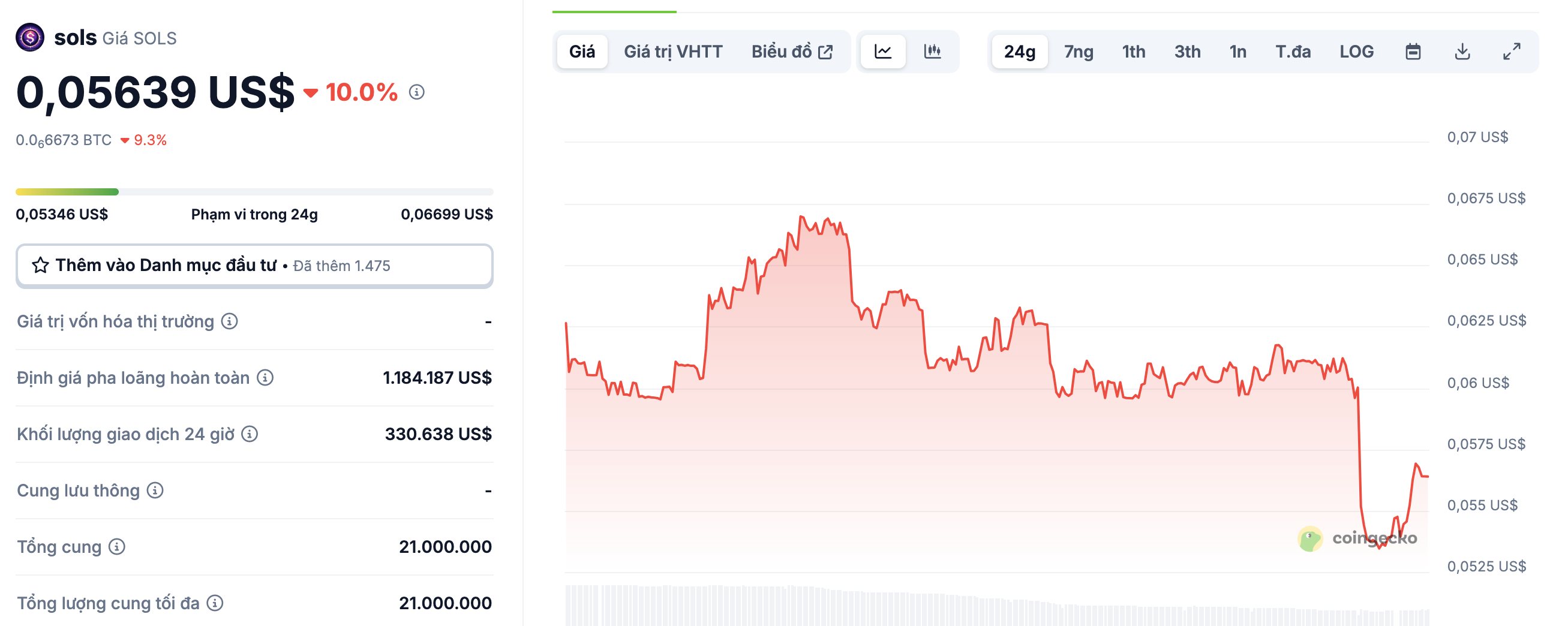 Giá hiện tại (tính đến ngày 18/4/2025) của SOLS là $0.05639 cho mỗi (SOLS / USD) với khối lượng giao dịch trong 24 giờ là $330k USD. Giá từ SOLS sang USD được cập nhật trong thời gian thực.