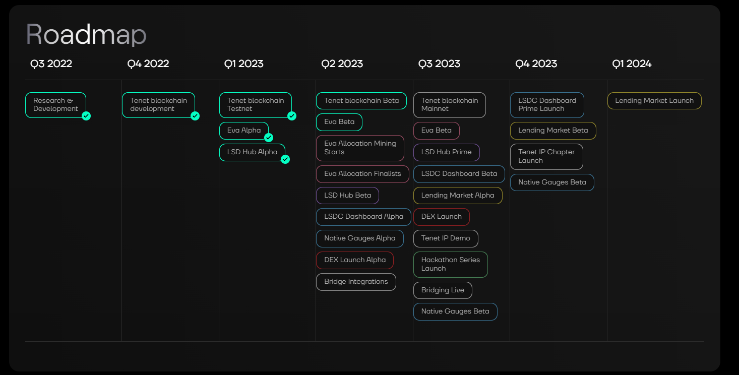 Dưới đây là Roadmap của Tenet Protocol , có thể thấy Q3 là một quý có nhiều sự kiện quan trọng của Tenet như việc mainnet , chúng ta hãy cùng chờ đợi liệu dự án có đi đúng tiến độ không nhé.