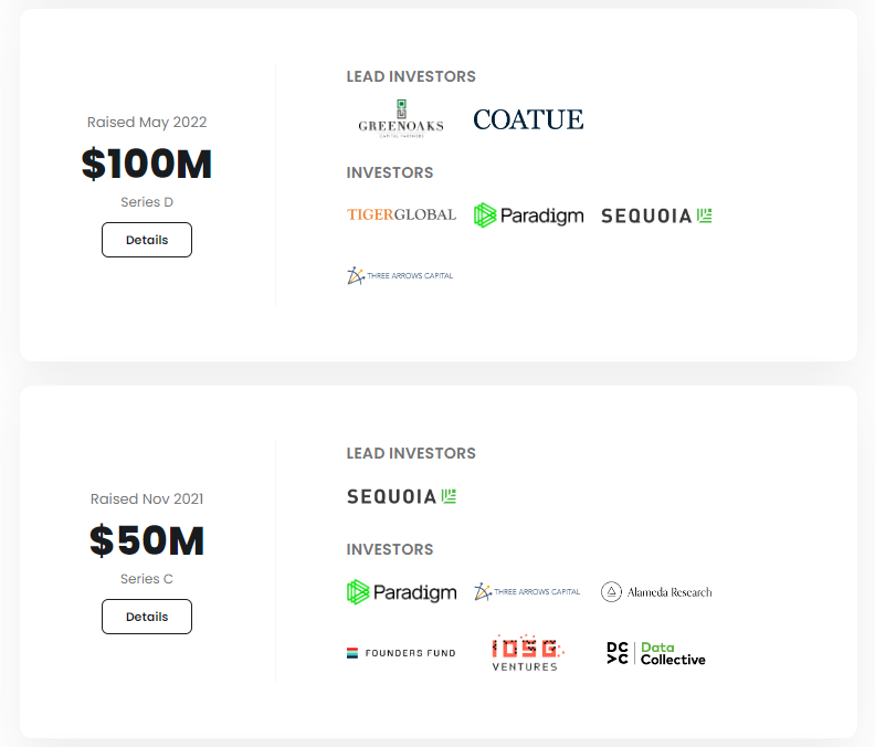 - Series C: Kêu gọi được tổng cộng $50M với định giá $2B, Paradigm có tham gia tuy nhiên không dẫn đầu vòng gọi vốn này.