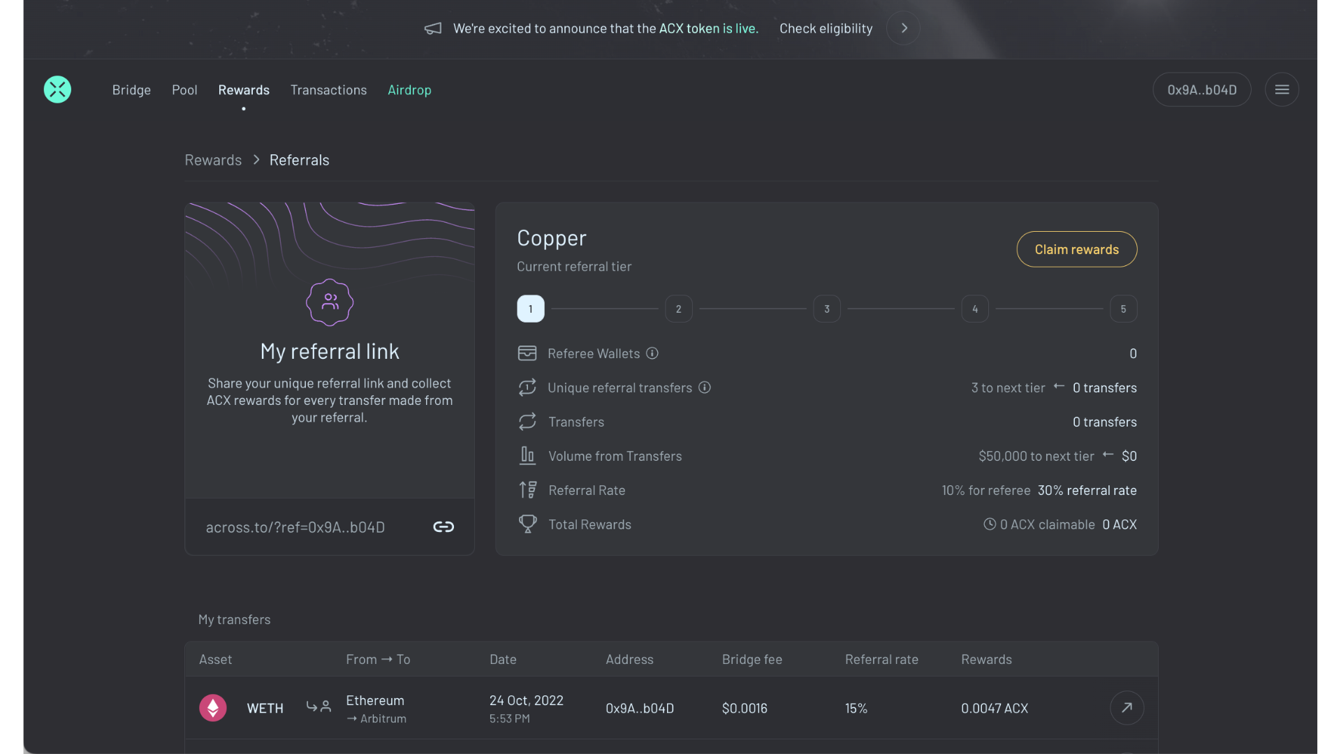 Tính năng mời người mới tham gia sử dụng bridge của Across nhằm khuyến khích người dùng tham gia sử dụng nền tảng.