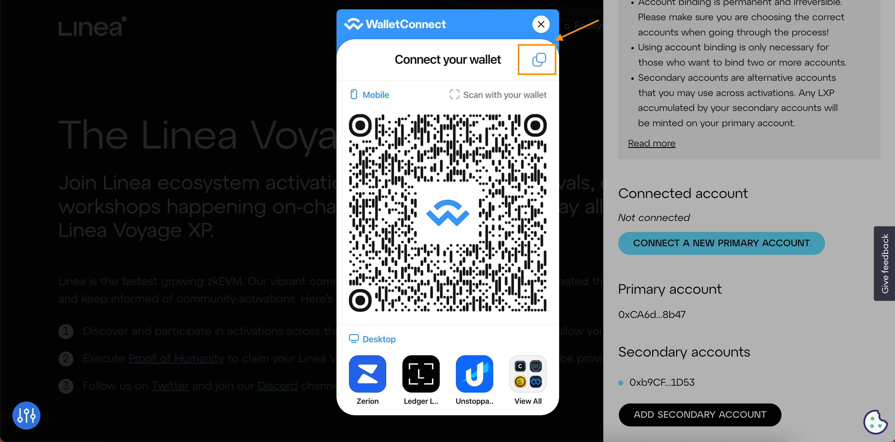 Bước 3: Bấm copy địa chỉ ví WalletConnect hiện ra trên màn hình