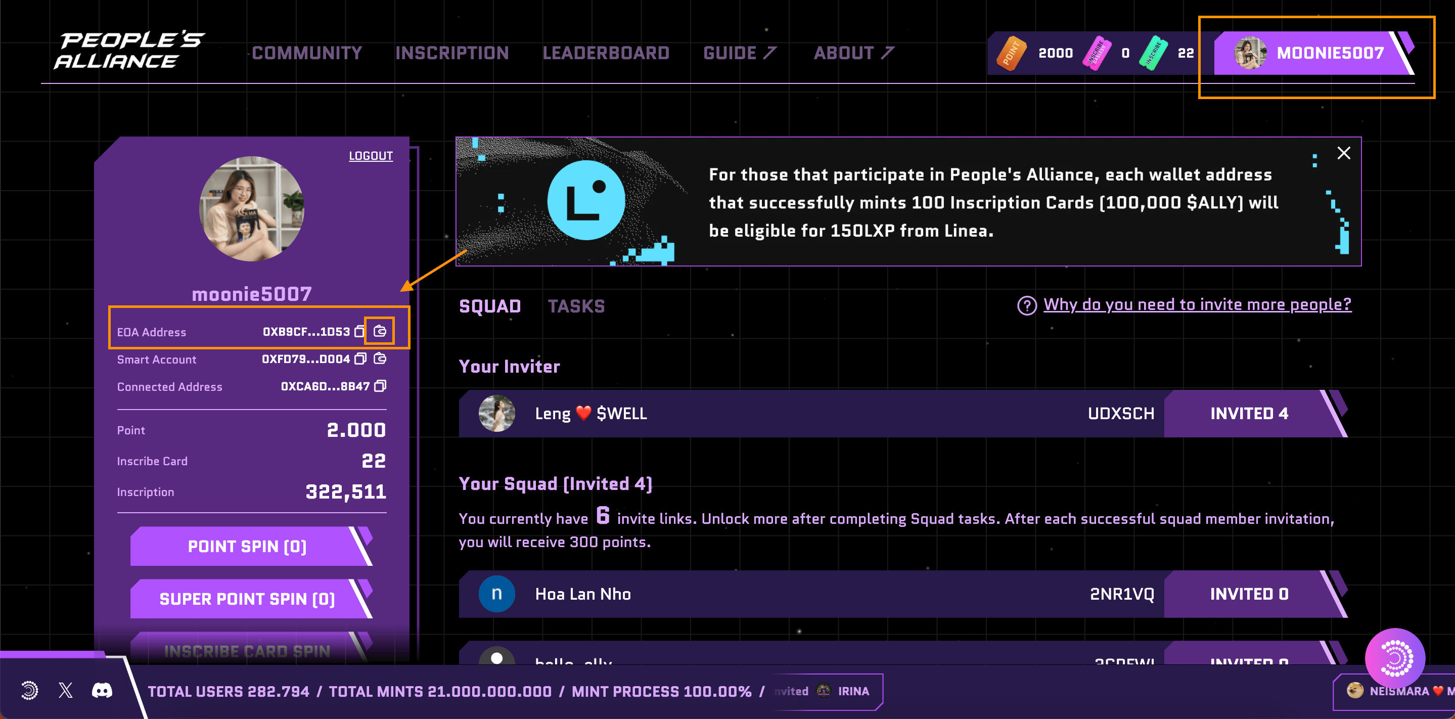 Đối với người dùng đã tham gia mint tối thiểu 100,000 $ALLY từ sự kiện phát hành inscription của People’s Alliance sẽ được nhận airdrop trị giá 150 LXP từ Linea.