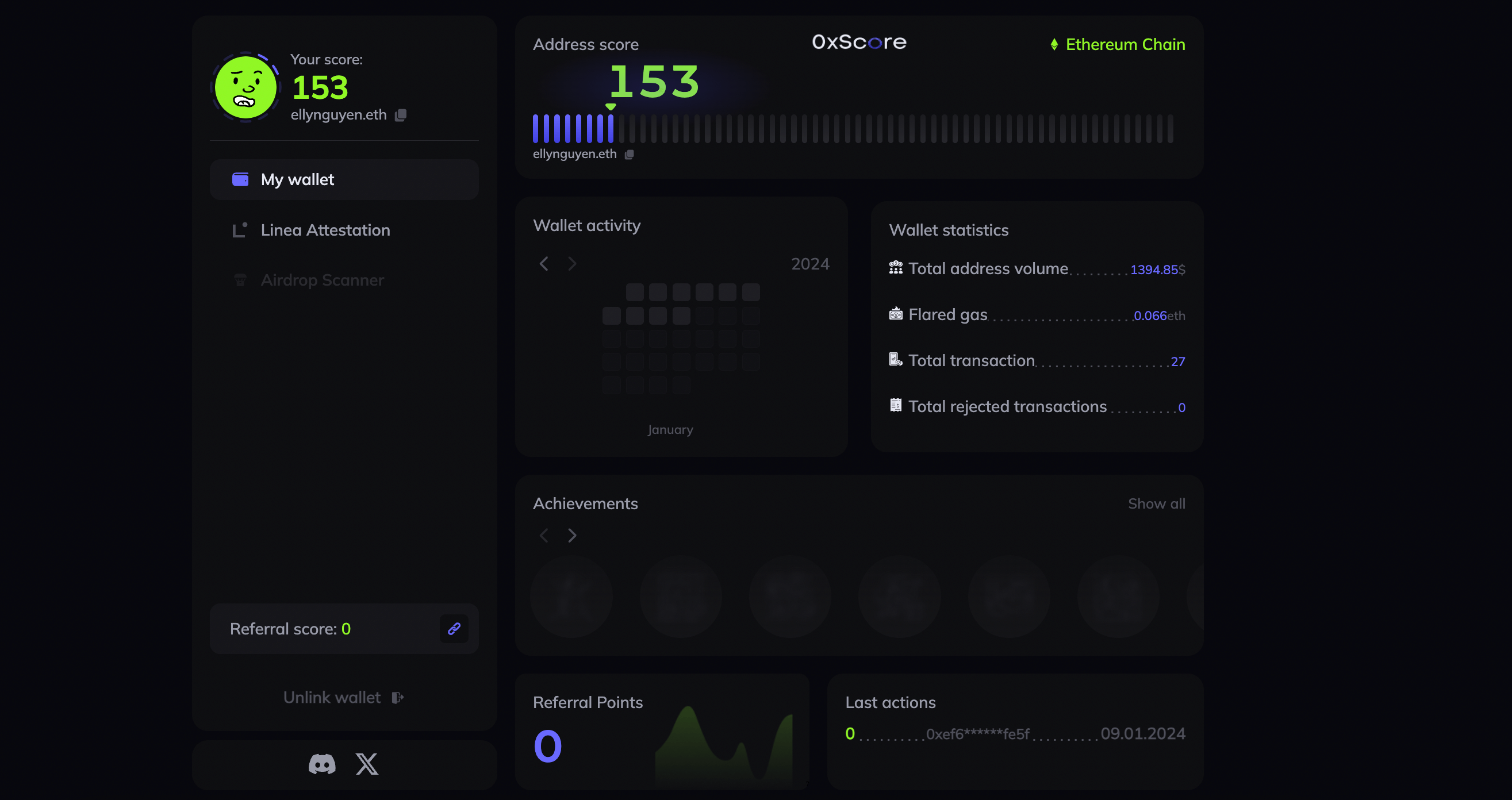 Chọn “My Wallet” ⇒ Kiểm tra số điểm tích lũy trên OxScore. Điều kiện bạn đạt được trên 50 điểm (bằng cách tương tác trên mạng lưới Linea) thì mới có thể xác thực tại OxScore.