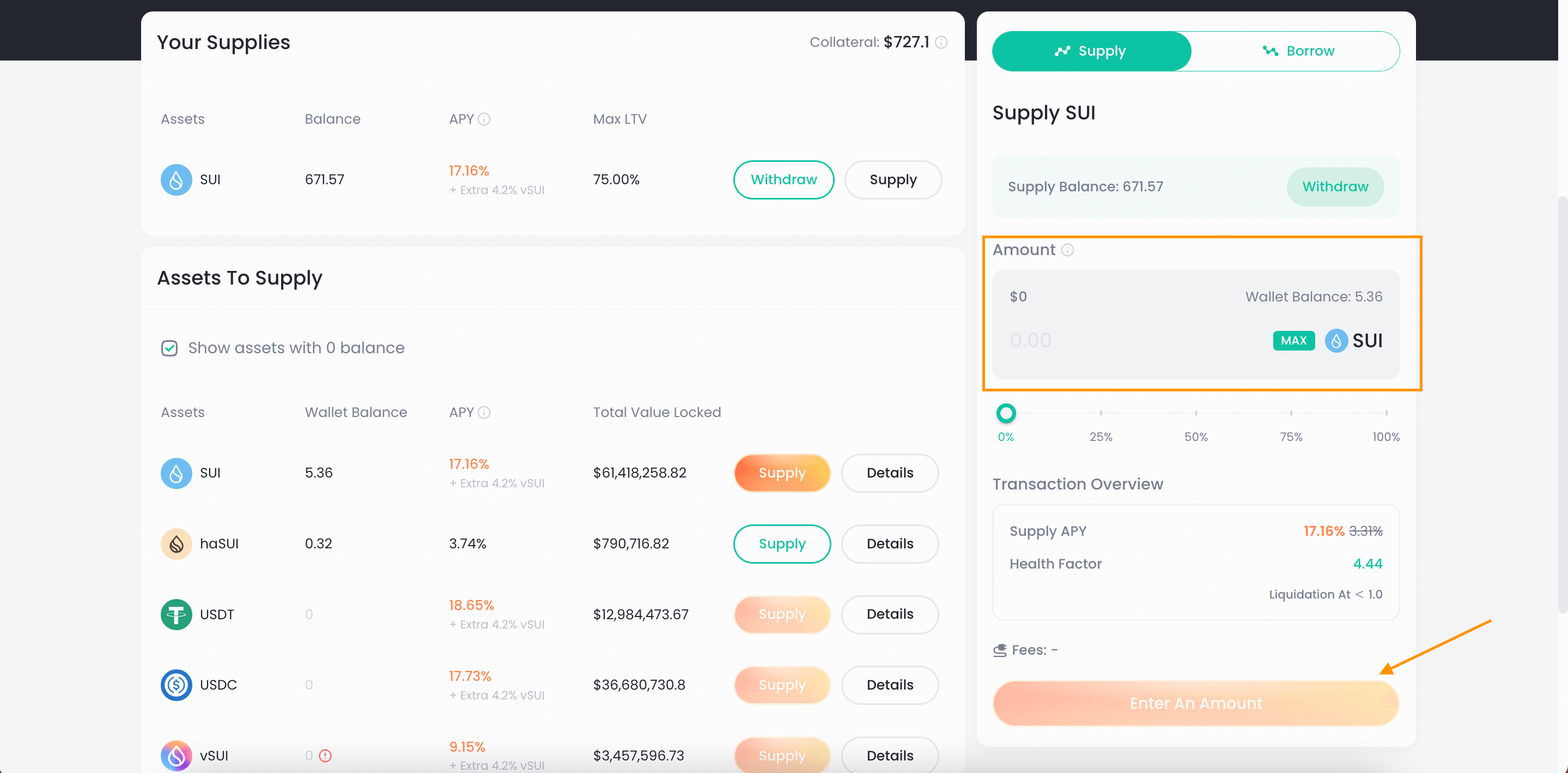 Bước 2: Chọn “Supply” → Nhập số lượng SUI → Chọn “Supply SUI”
