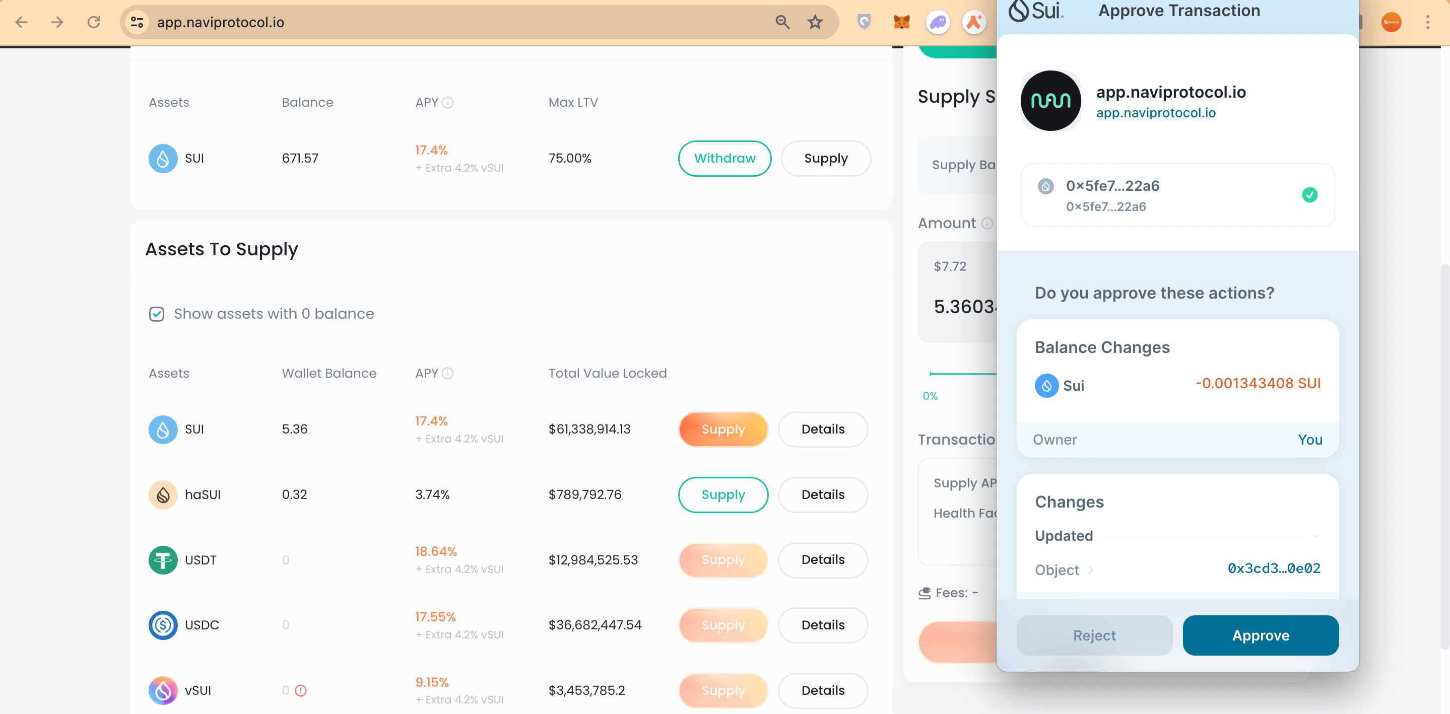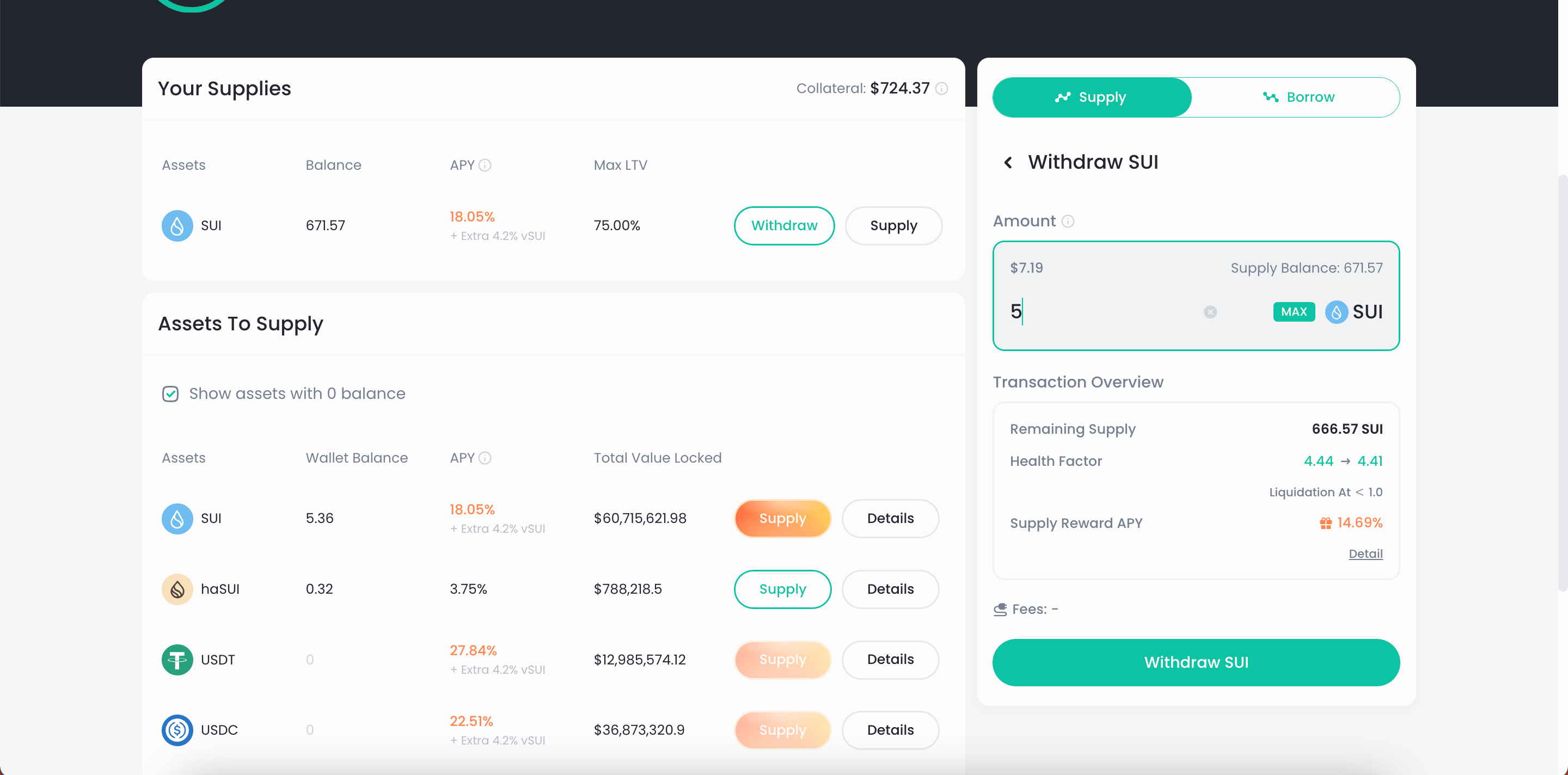 3.1. Supply SUI, USDC, USDT, vSui (LST của Sui)