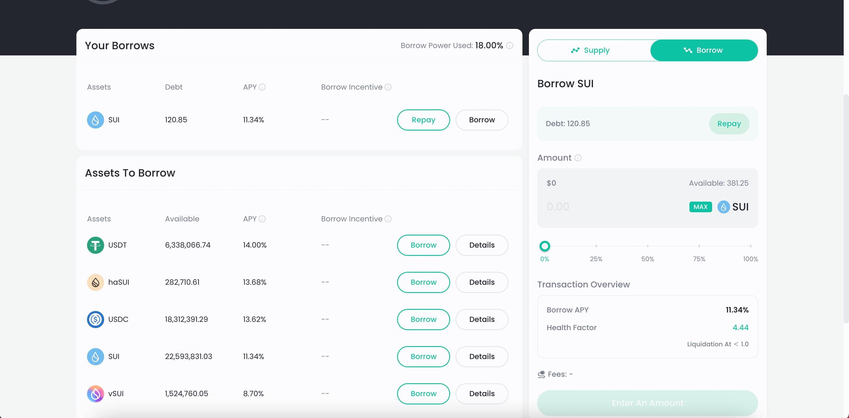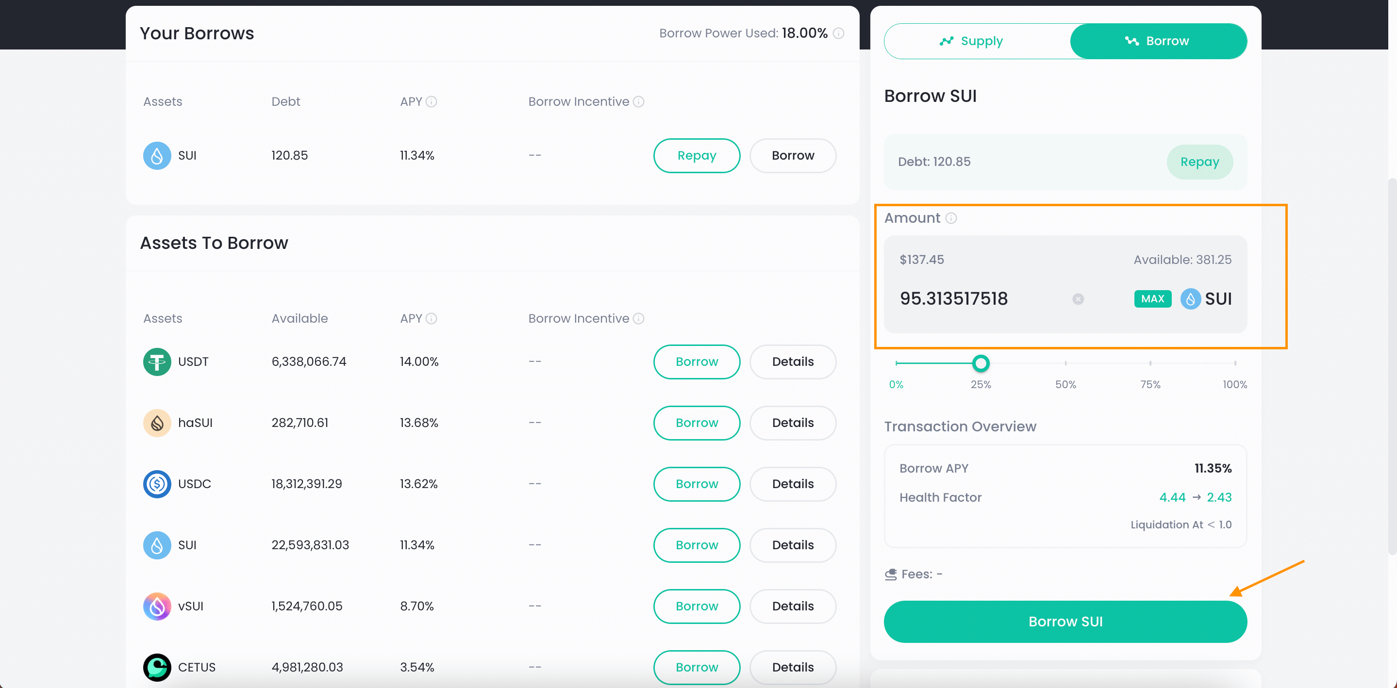 Bước 2: Nhập số lượng muốn borrow → chọn “ Borrow SUI”