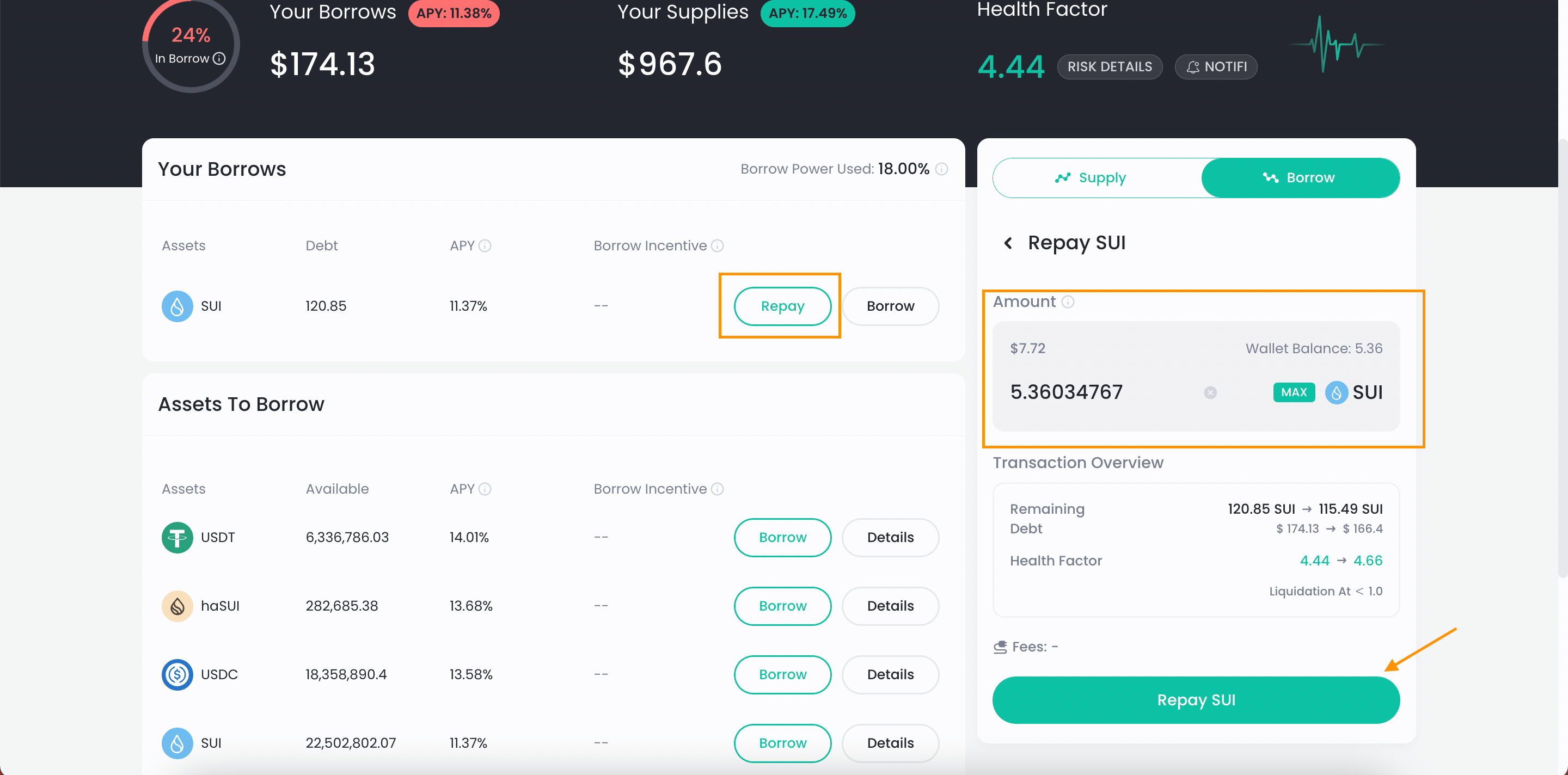 - Nhập số lượng token muốn trả → chọn “Repay”