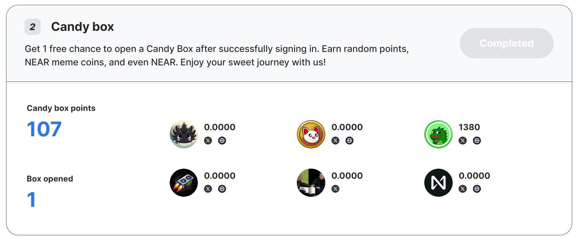 - Nhiệm vụ 2: Click "Open" để mở hộp quà. Một số phần thưởng các bạn có thể nhận được là points, các memecoin và thậm chí cả $NEAR. Phí khi mở box sẽ là 0.0007 $NEAR
