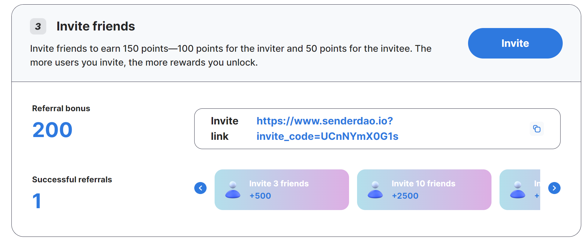 Dự án mới chuyển sang Season 2 nên số points mà các bạn có được trong mùa 1 sẽ không còn. Hiện tại người dùng có thể kiếm điểm bằng cách điểm danh hàng ngày, mở hộp quà, mời người khác tham gia vào Sender thông qua link mời. Các bước thực hiện chi tiết như sau: