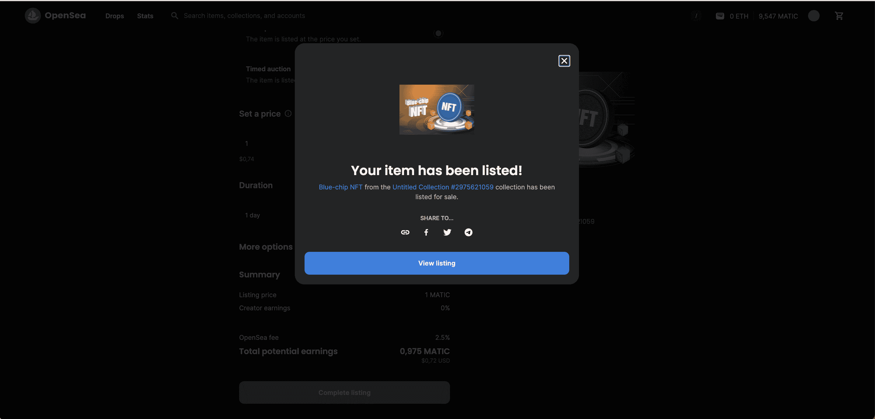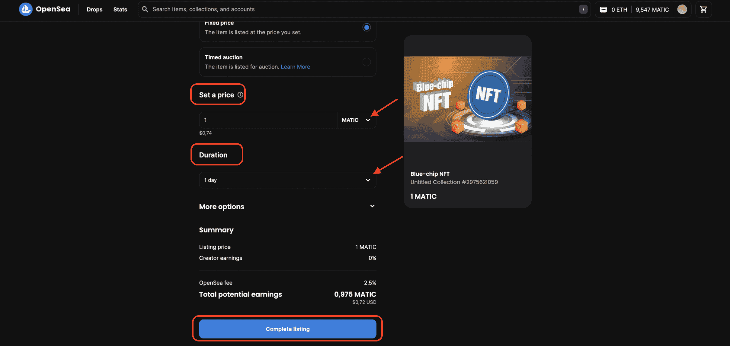 Bước tiếp theo bạn cần làm là điền thông tin về giá bạn muốn bán NFT và thời gian treo bán. Như hình dưới, NFT đang được treo bán với giá 1 MATIC trong vòng 1 ngày. (người dùng có thể tuỳ chỉnh lựa chọn giữa việc bán NFT bằng ETH/ MATIC) Sau đó ấn Complete listing để hoàn tất.