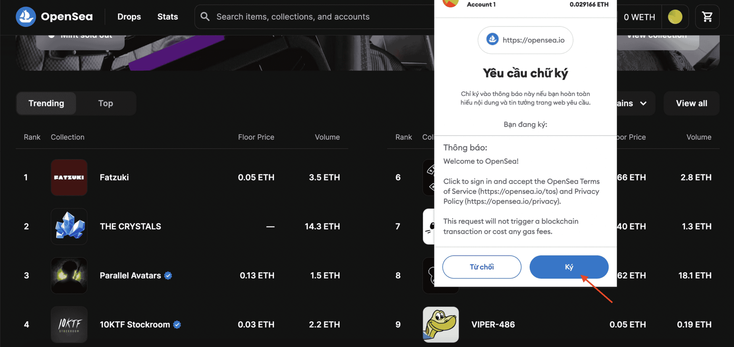 Sau khi click vào Metamask, hãy click vào phần ký để chấp nhận kết nối Metamask với OpenSea.