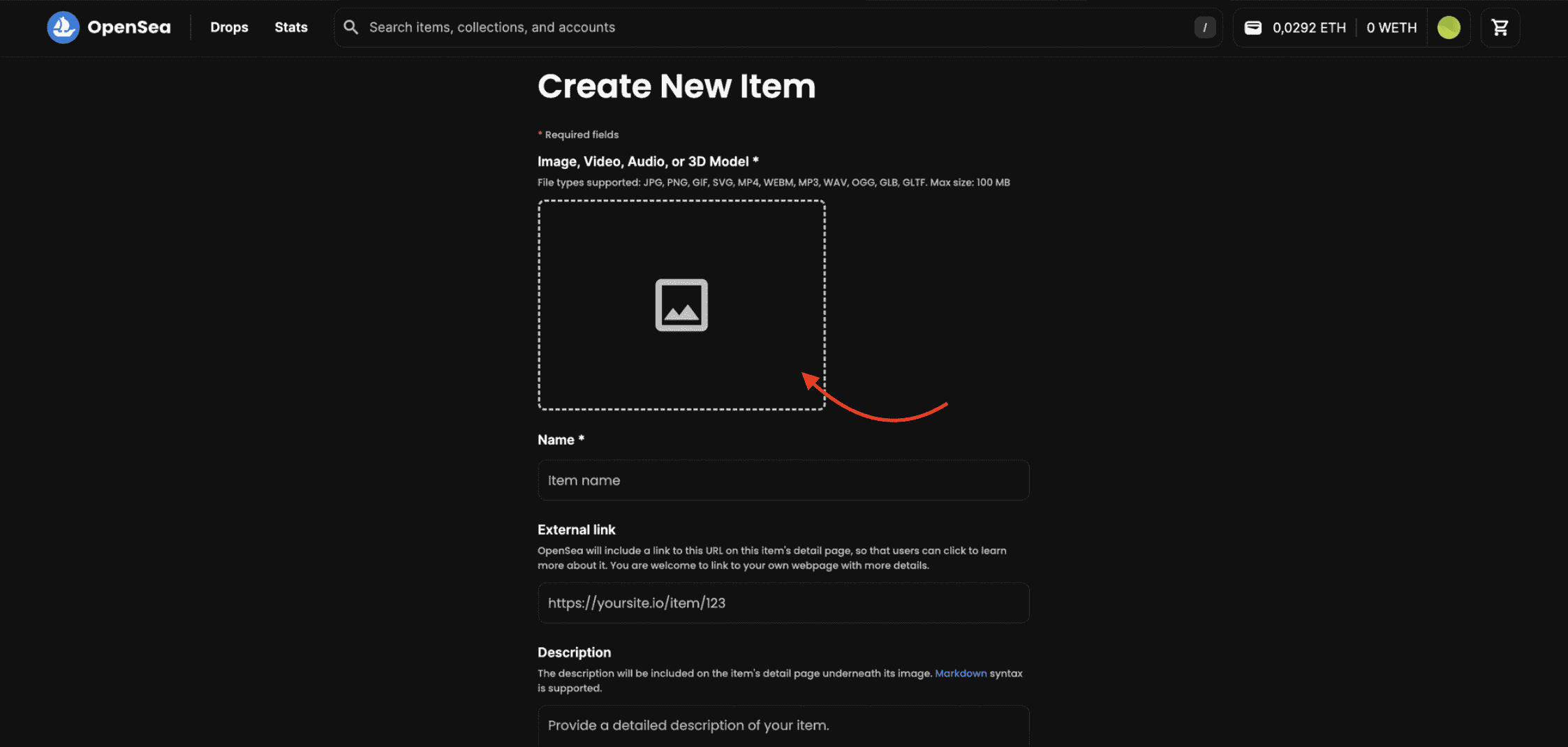 - Bước 4: click vào icon hình ảnh trên hình để thêm ảnh bạn muốn tạo thành NFT. Sau khi chọn được ảnh, bạn cần điền đầy đủ các thông tin theo yêu cầu của OpenSea.