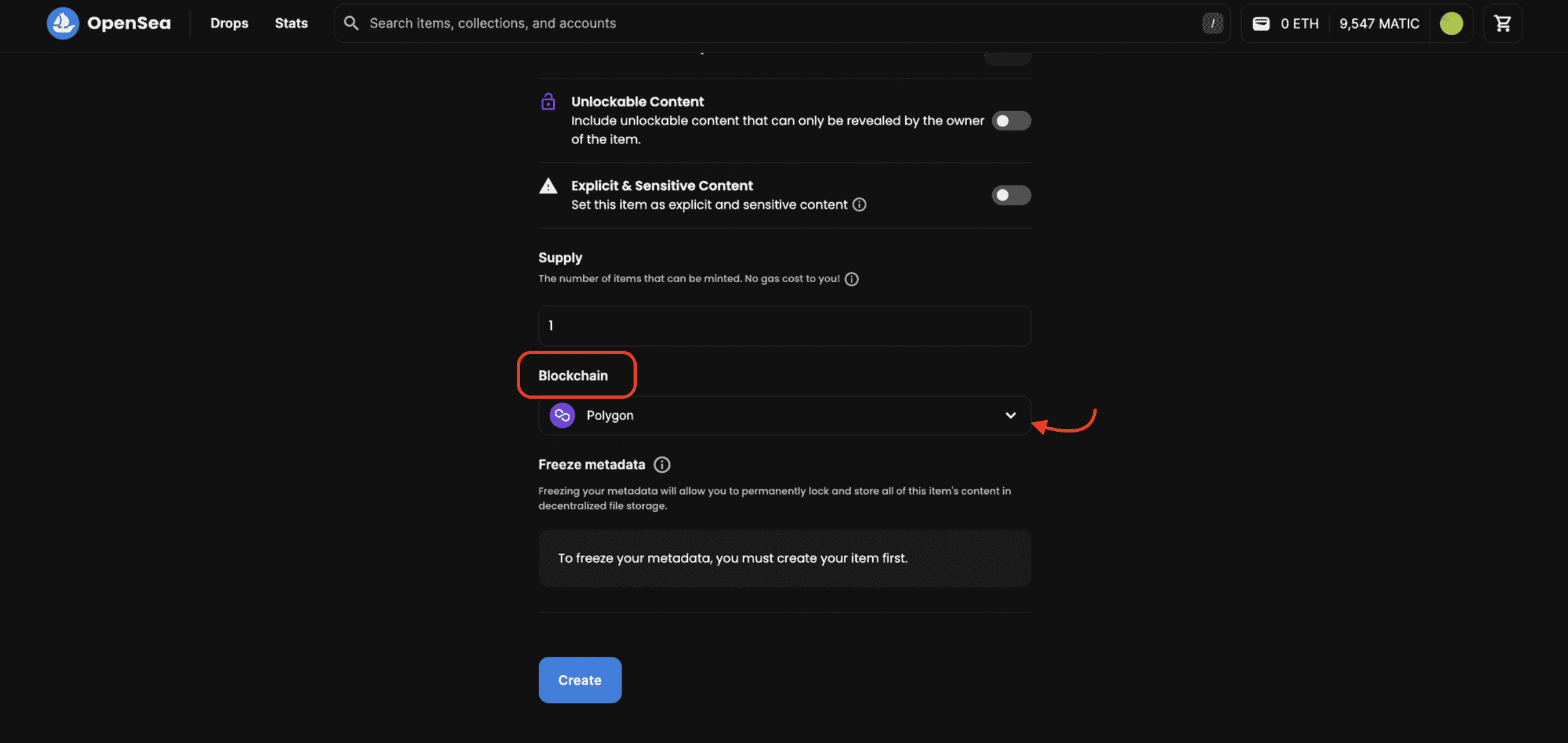 - Blockchain: Chọn blockchain mà bạn muốn mint NFT. Ethereum là phổ biến nhất nhưng bạn cũng có thể chọn Polygon để tiết kiệm phí gas.
