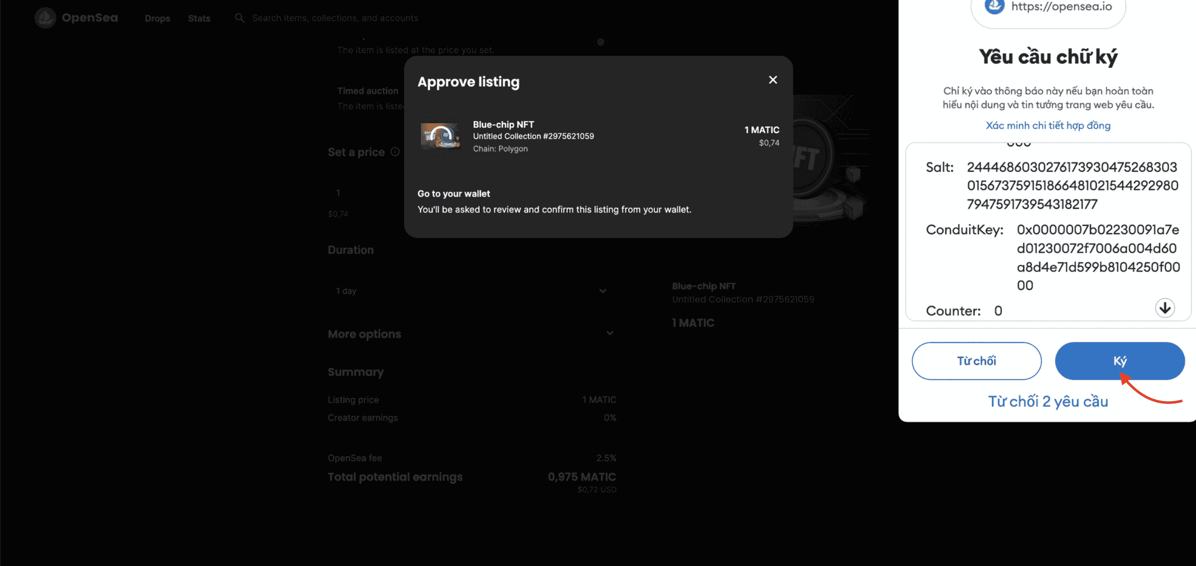Click vào phần Ký để xác nhận giao dịch. Sau đó giao diện listing của NFT sẽ được hiển thị như sau.