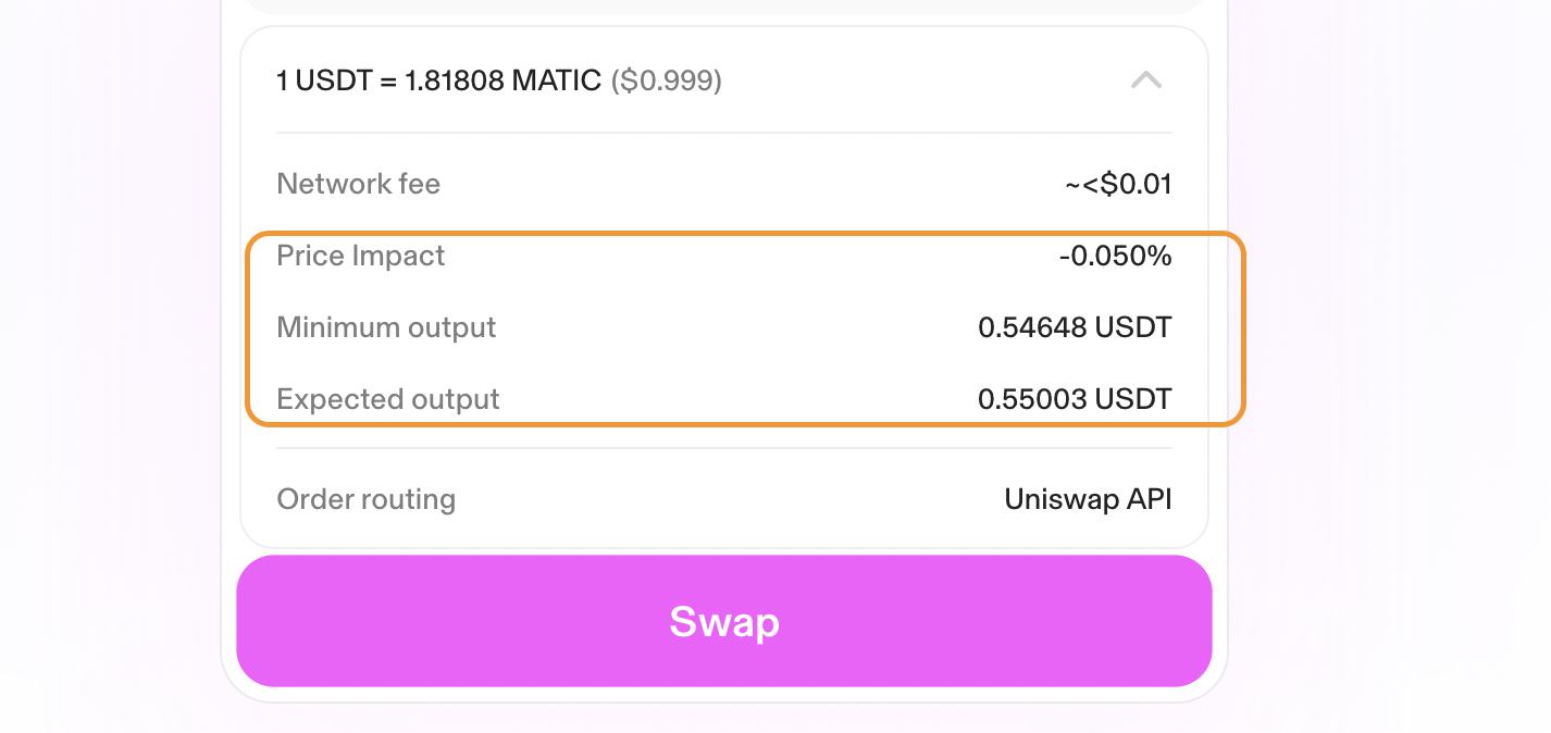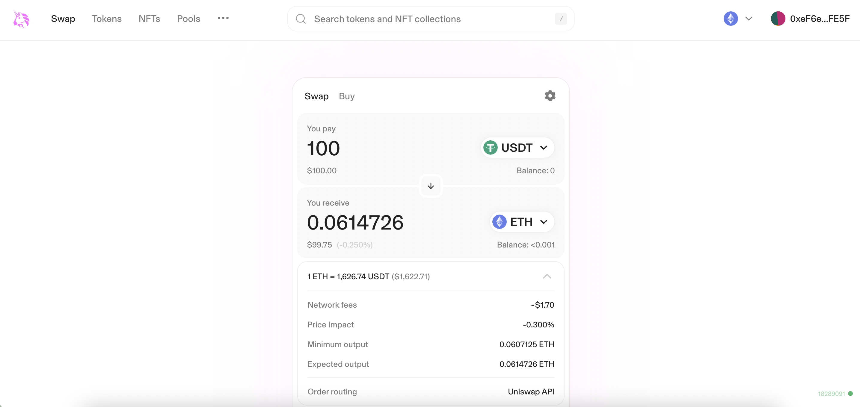 Giao dịch trên DEX thường được gọi là “swap” tức là việc bạn hoán đổi 1 token A thành 1 token B. Ví dụ bạn muốn dùng 100 USDT để mua ETH trên sàn Uniswap, bạn cần thực hiện thao tác “swap” để hoán đổi 100 USDT lấy số lượng ETH tương ứng (~0.06 ETH).