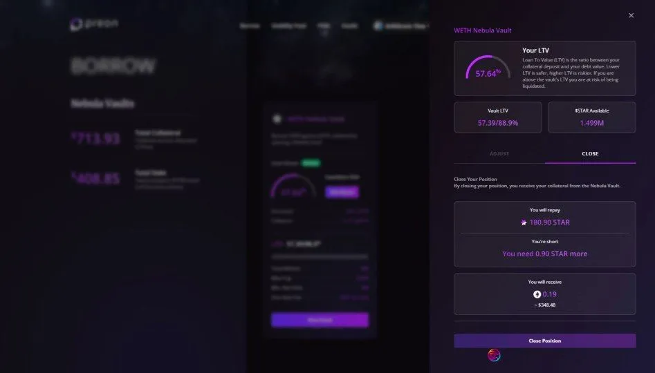 - Đóng vị thế: Để đóng hoàn toàn vị thế của bạn, chỉ cần chuyển đến tab “Đóng”. Bạn sẽ cần phải có đủ số tiền $STAR cần thiết để hoàn trả để đóng vị thế của mình, bằng với tổng số $STAR bạn đã vay từ kho tiền này cộng với phí vay của bạn và nếu vị thế của bạn đã mở ít hơn 180 ngày, phần còn lại của phí vay tối đa sẽ được trả lại cho bạn.