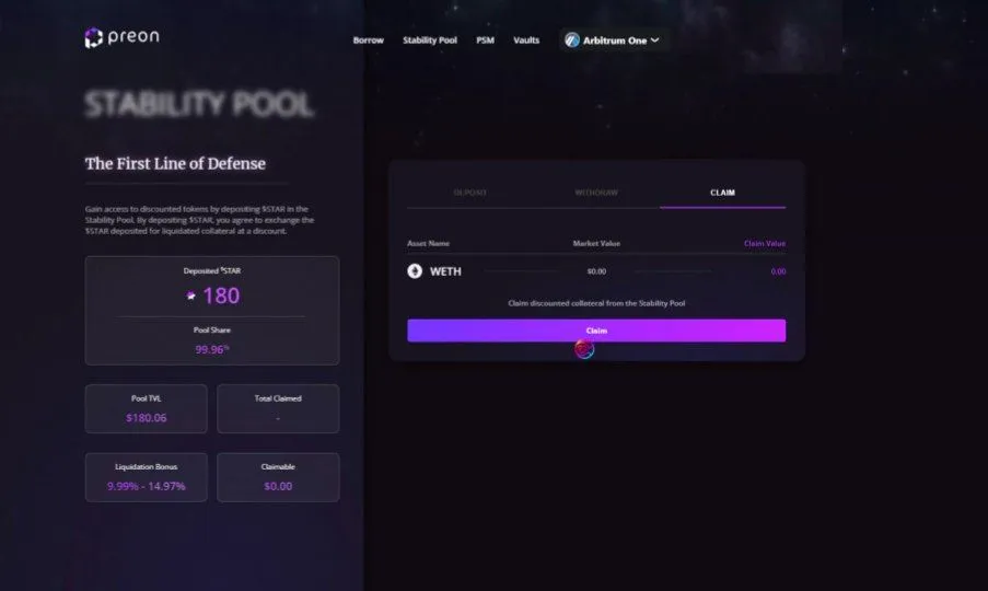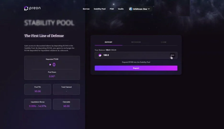 - Bước 2: Sau khi nhận được $STAR, người dùng có thể tham gia cung cấp thanh khoản trên Stablility Pool của Preson Finance để nhận được phí.