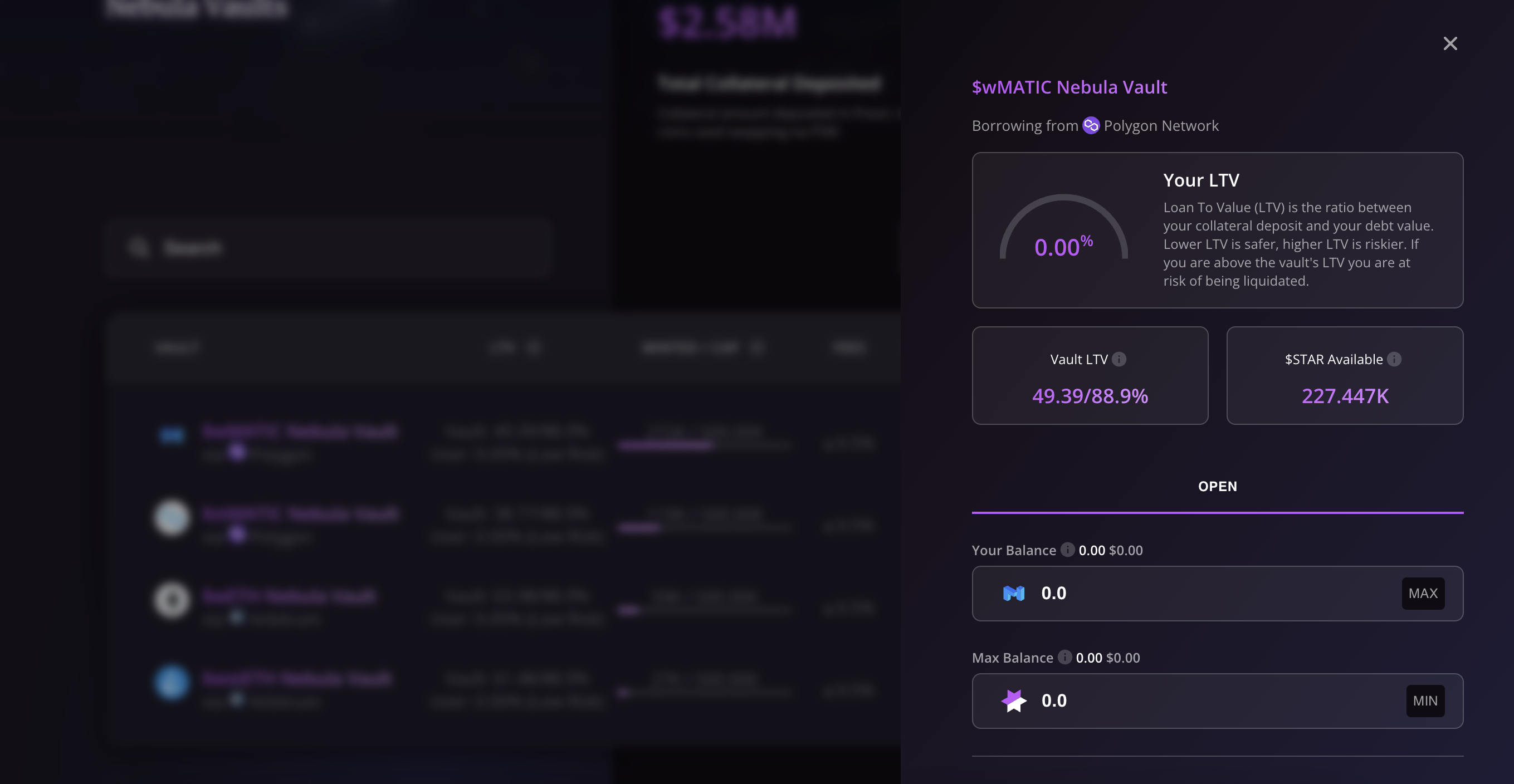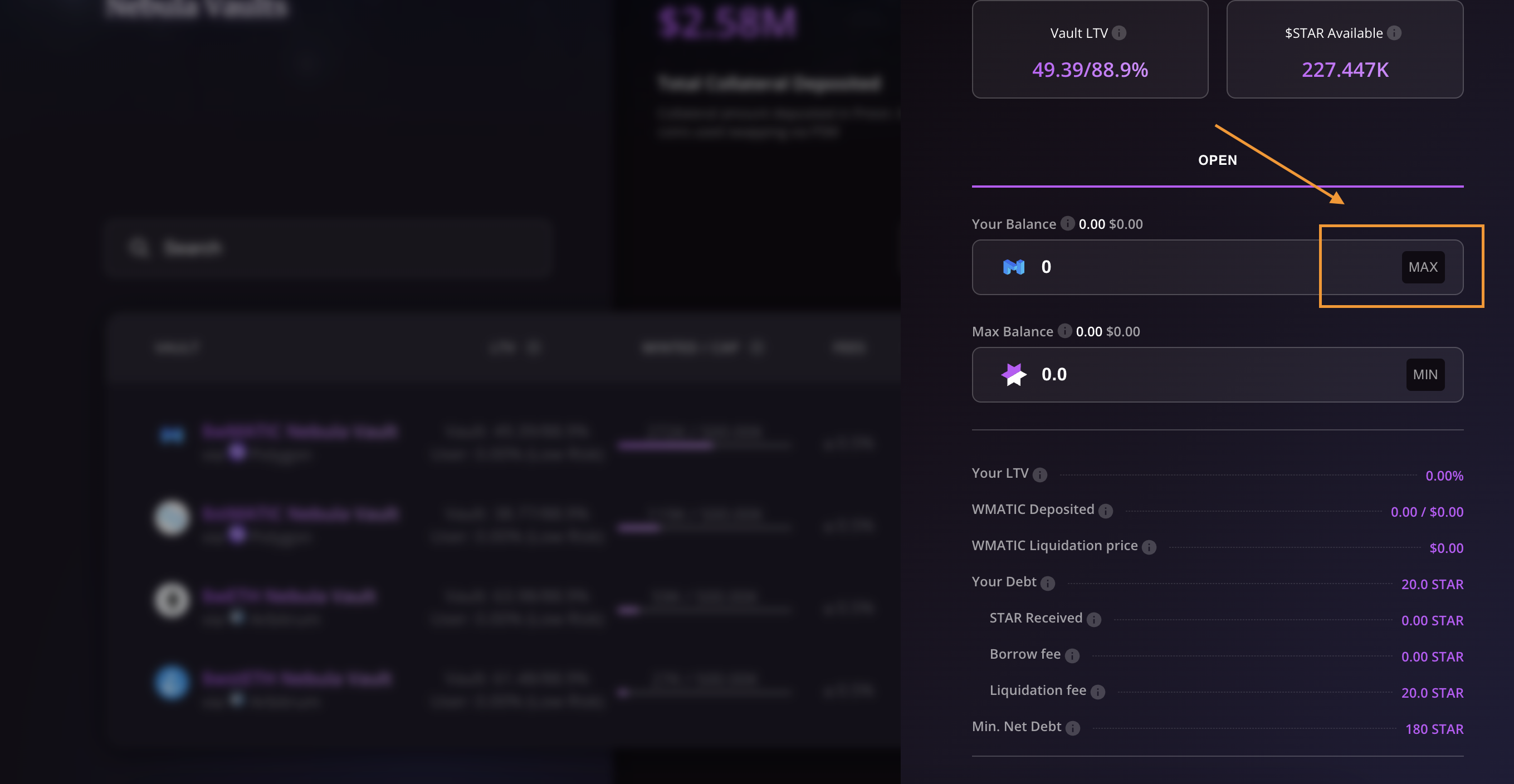 - Bước 1: Người dùng tạo Nebula Vault và gửi tài sản thế chấp để vay $STAR. Giao thức sẽ không tính lãi vay tuy nhiên người dùng phải trả một khoản phí vay cố định là 0.5% nếu khoảnh nợ kéo dài hơn 6 tháng.