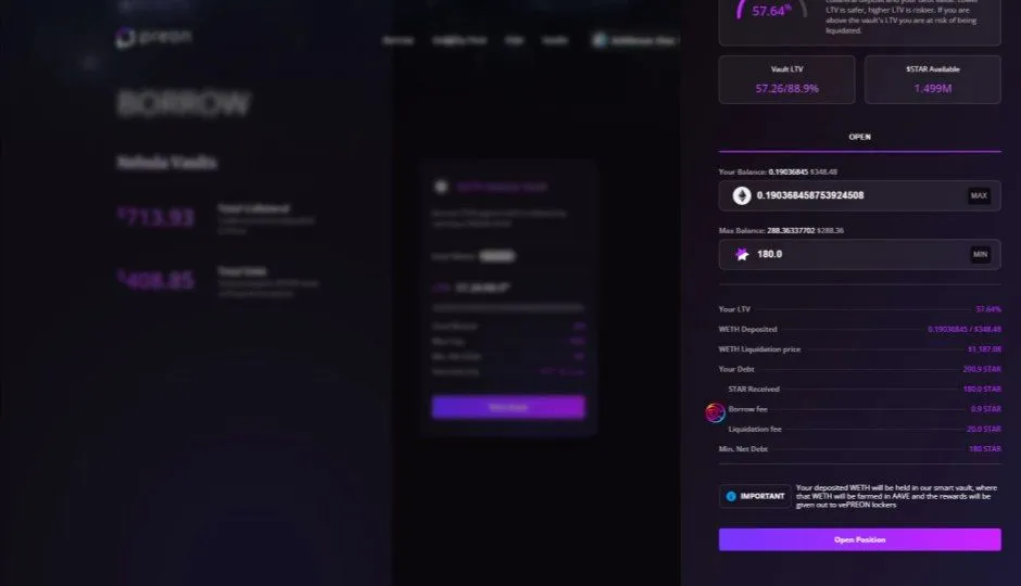 - Mở một vị thế: Sau khi đảm bảo các thông số khoản vay của bạn đạt yêu cầu, hãy click vào “Open Position” và xác nhận giao dịch. Tài sản thế chấp của bạn sẽ được gửi, bạn sẽ nhận được $STAR trong ví của mình và LTV của bạn sẽ được cập nhật để phản ánh trạng thái khoản vay của bạn.