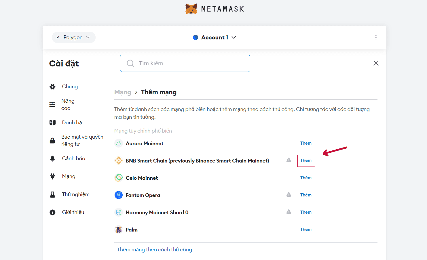 2. Thêm mạng Binance Smart Chain (BSC) vào MetaMask