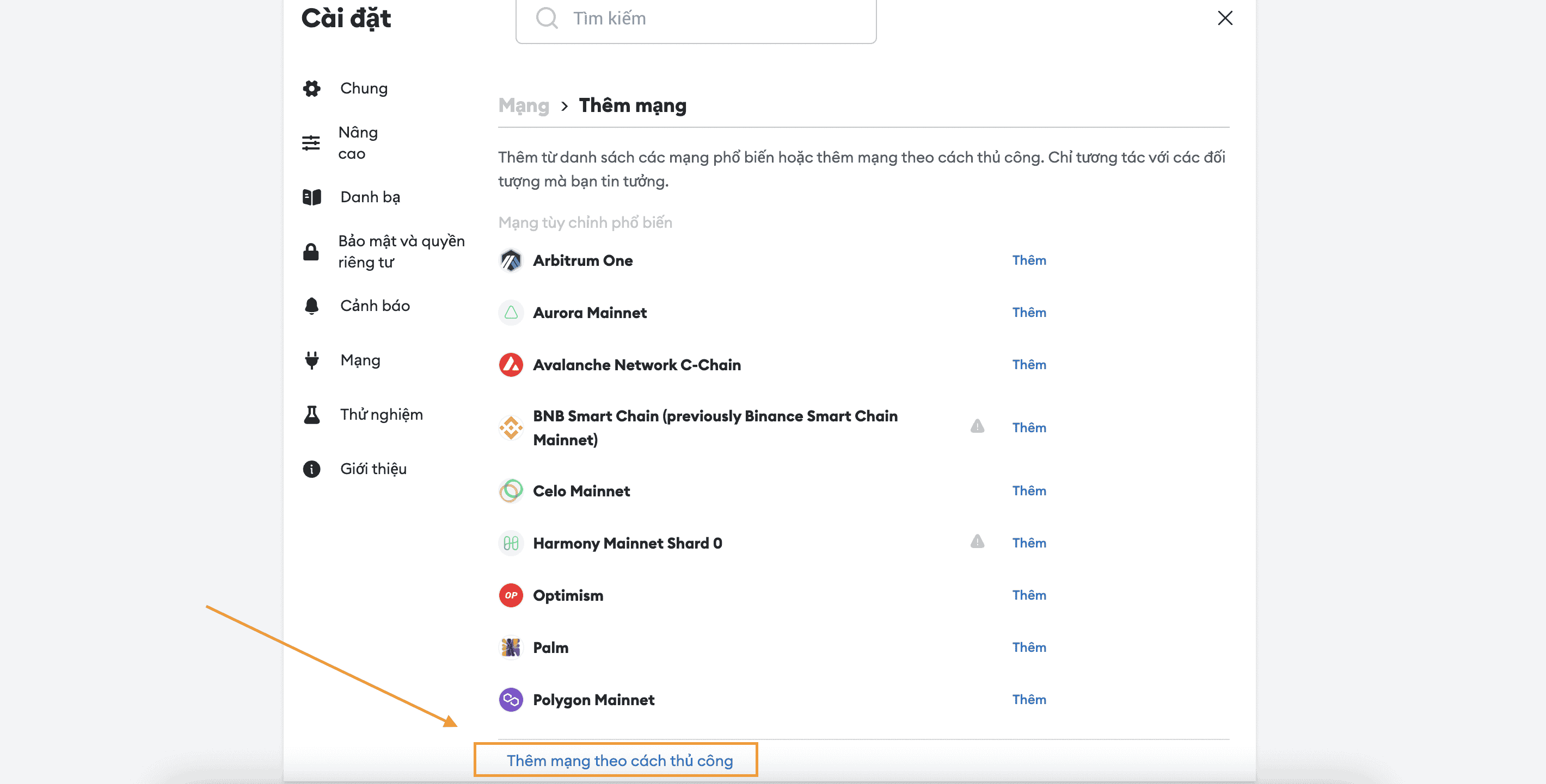Trong cửa sổ cài đặt MetaMask, chọn phần các mạng lưới ở góc trái màn hình sau đó click vào nút "Thêm mạng" hoặc "Add Network".