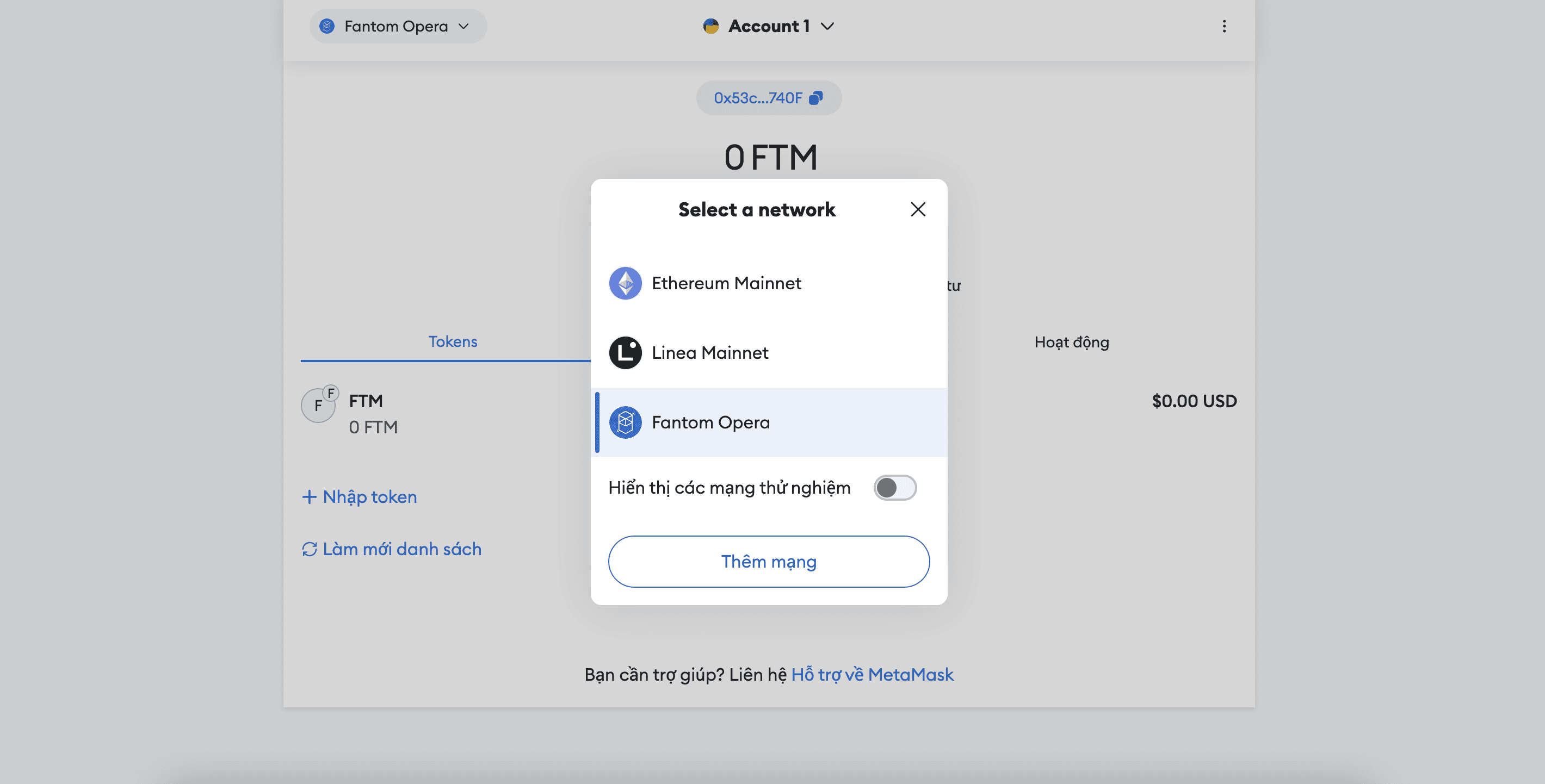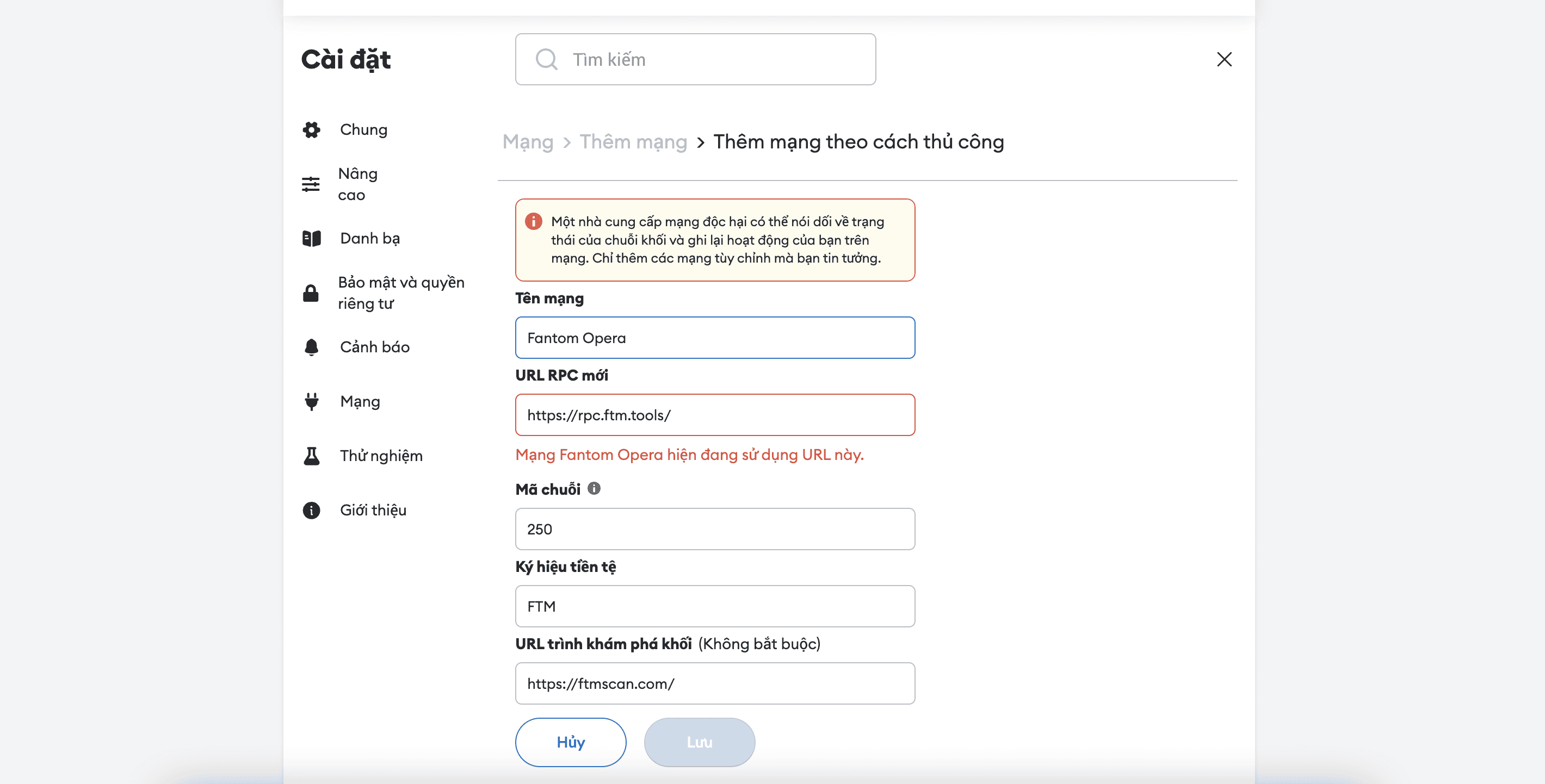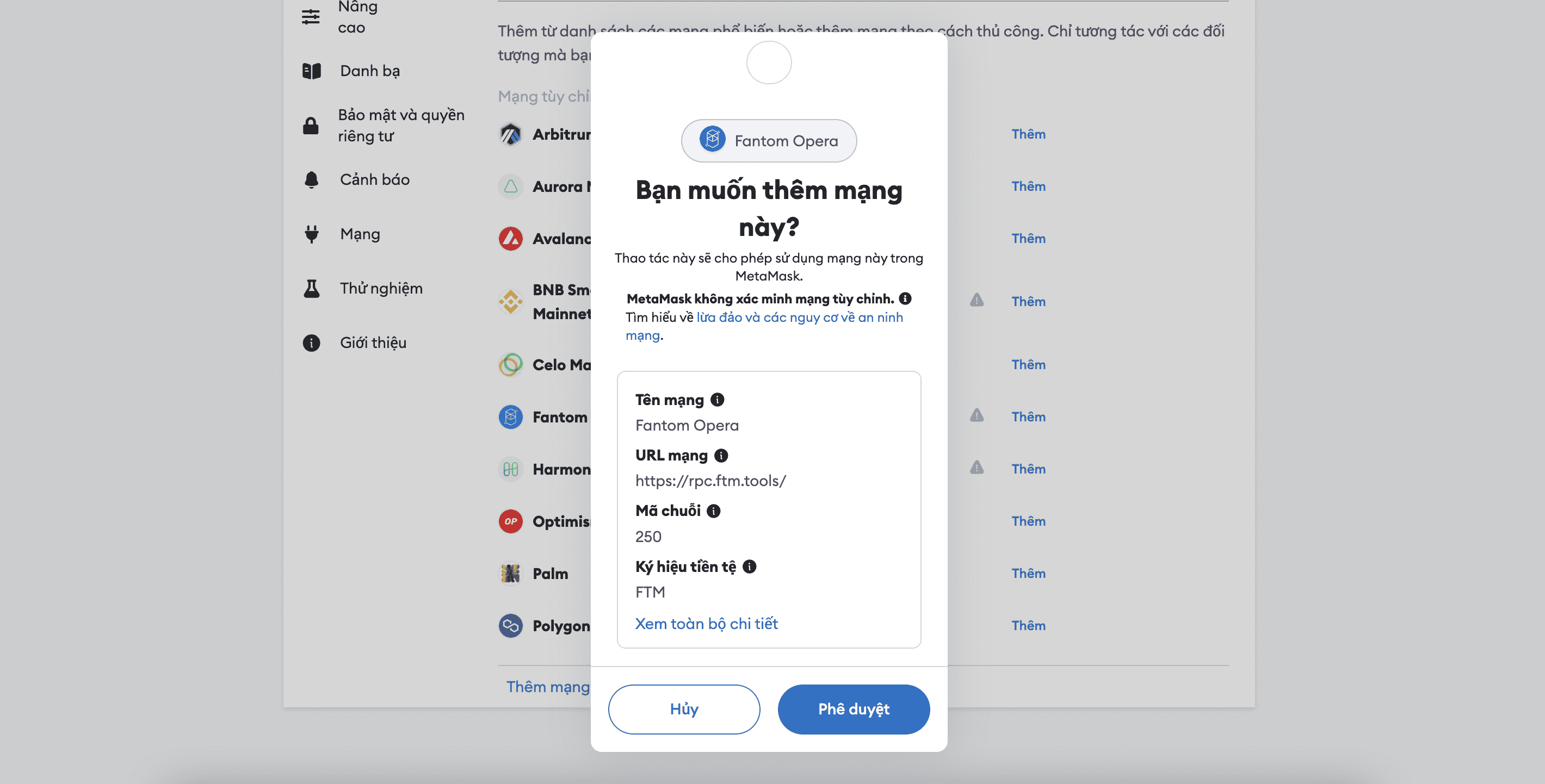Lưu ý, với thao tác thêm mạng thủ công, bạn có thể thêm bất kỳ mạng lưới nào được tích hợp trên MetaMask ngoài Fantom với thao tác như trên.