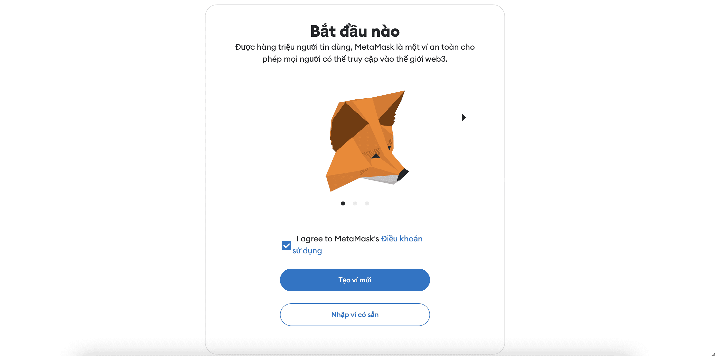 Lưu ý, bước này dành cho bạn nào lần đầu tiên sử dụng ví MetaMask, nếu bạn nào đã có sẵn tài khoản Metamask trong thiết bị của mình vui lòng bỏ qua bước này.