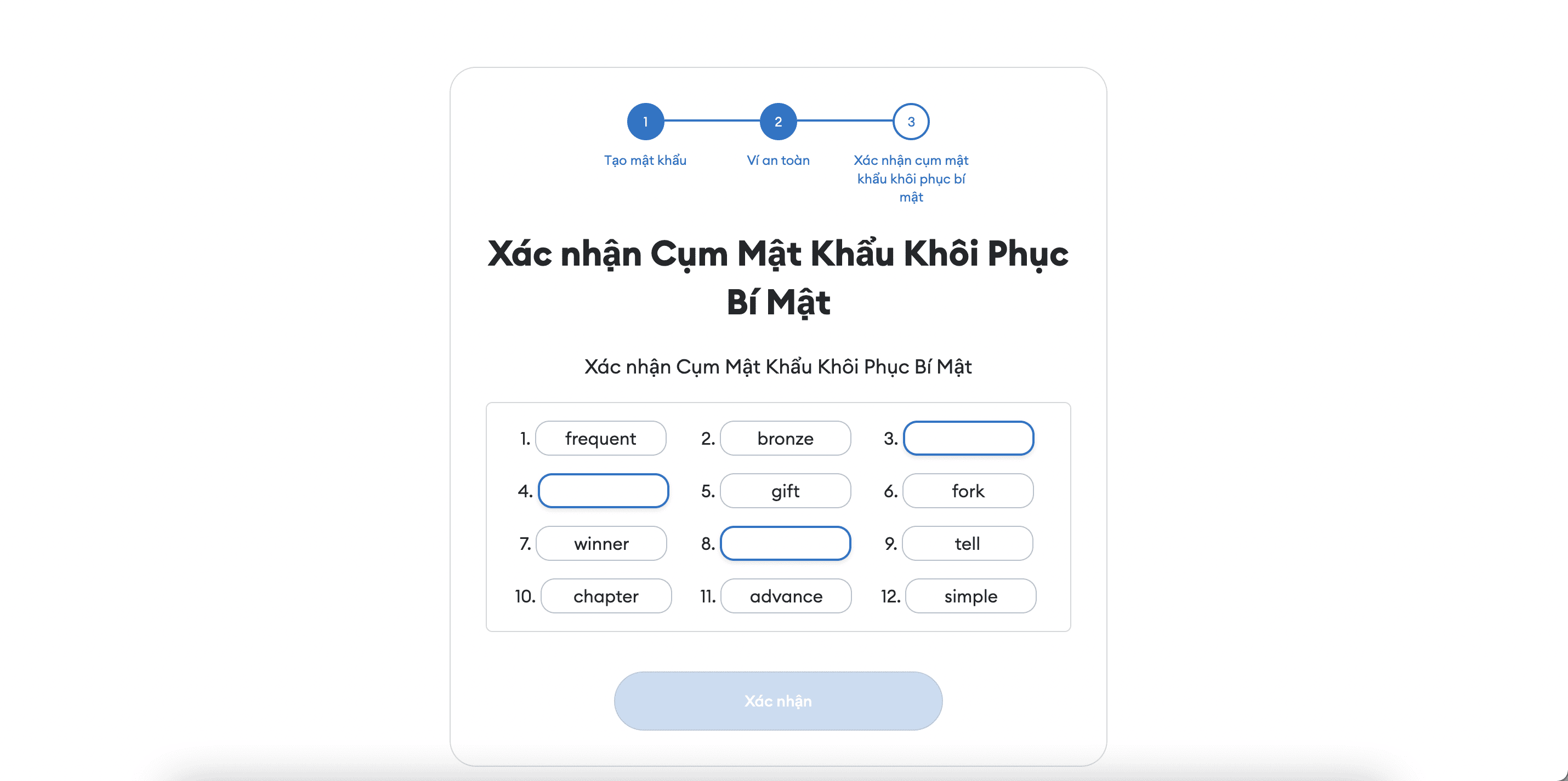 Bước 4: Xác nhận cụm mật khẩu khôi phục bí mật của ví và hoàn thành.